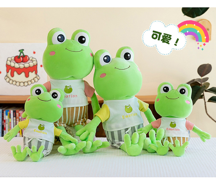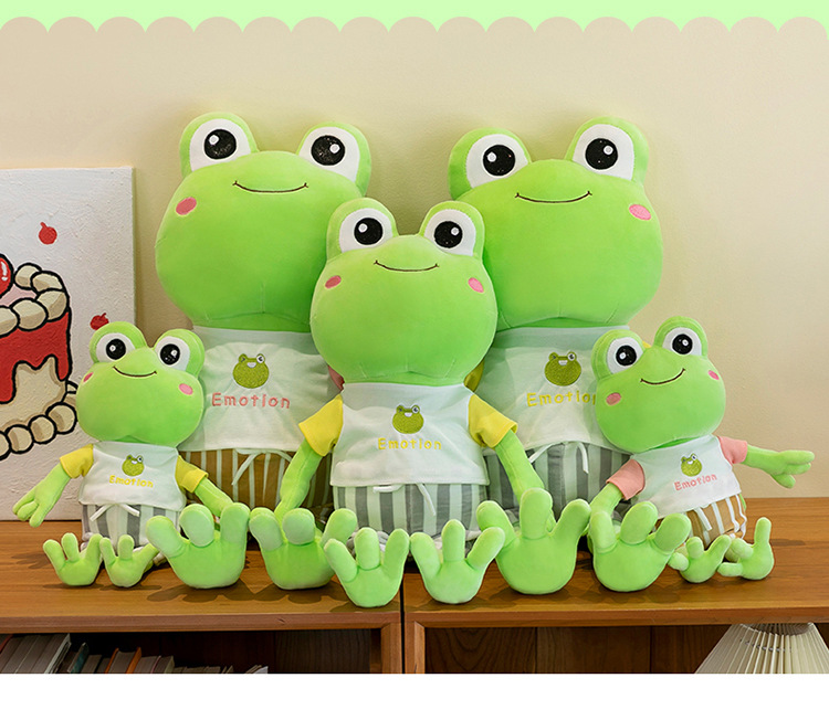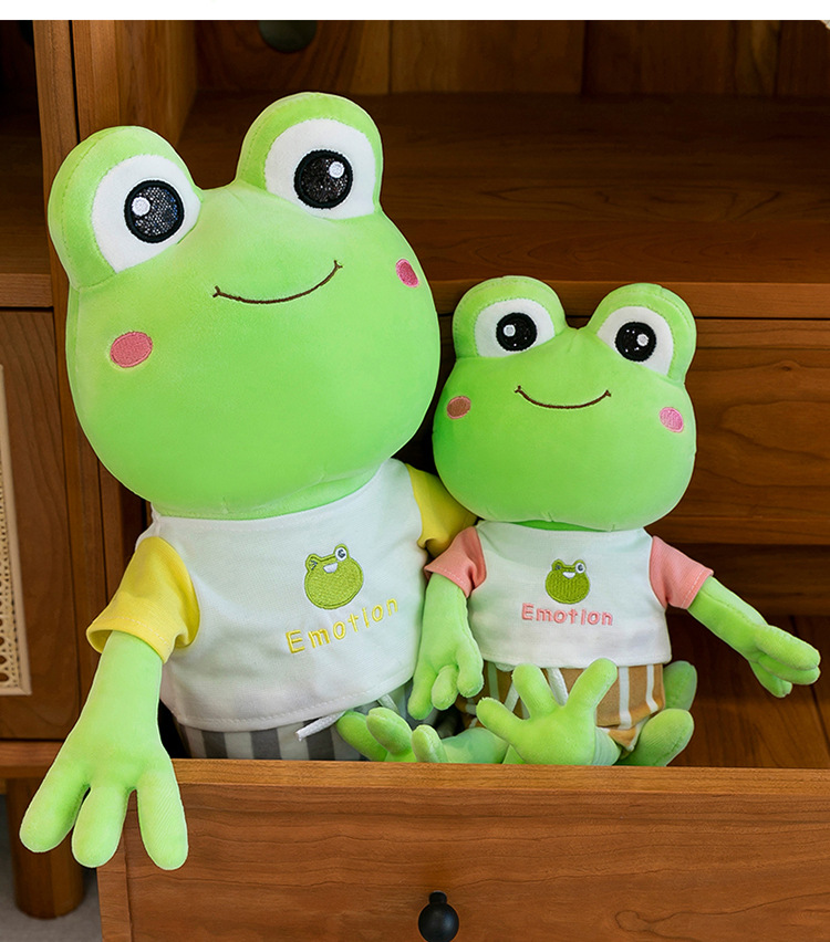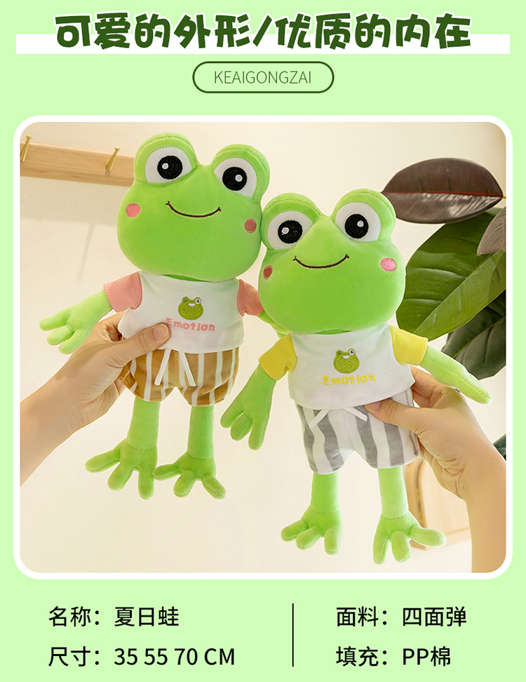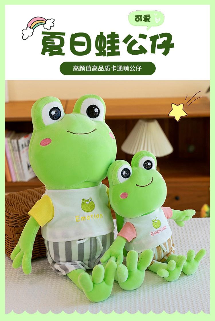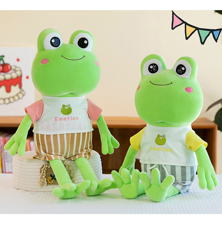かわいい夏のカエルのぬいぐるみの子供たちは、子供のソファをなだめて、オフィス人形の誕生日プレゼントを飾っています