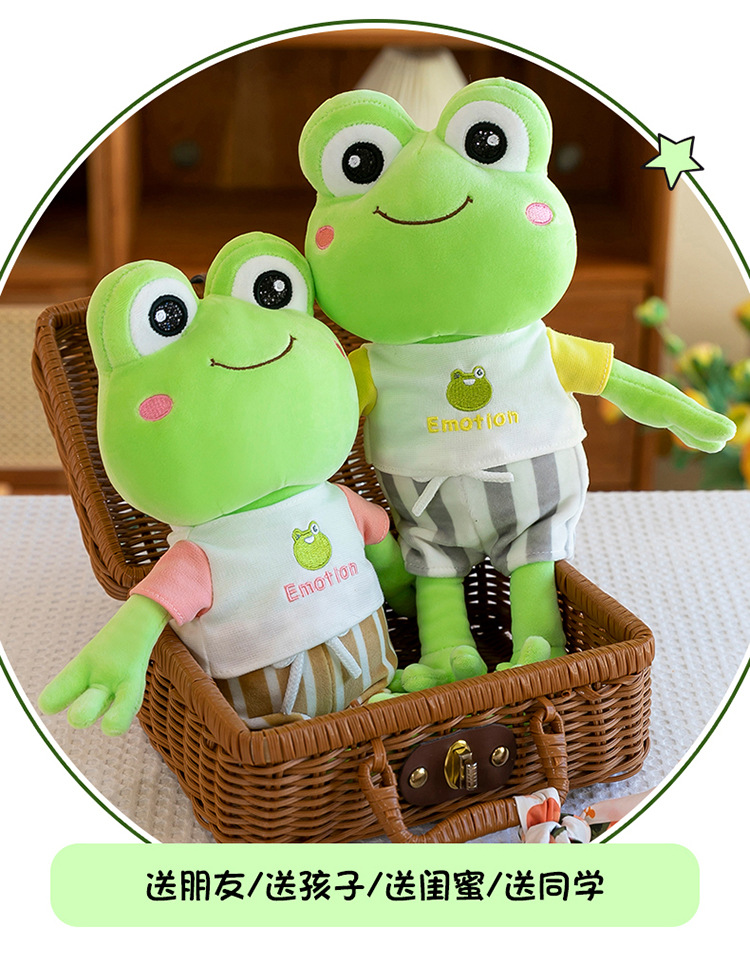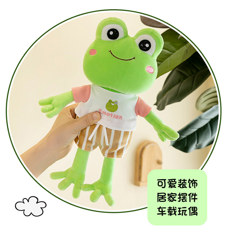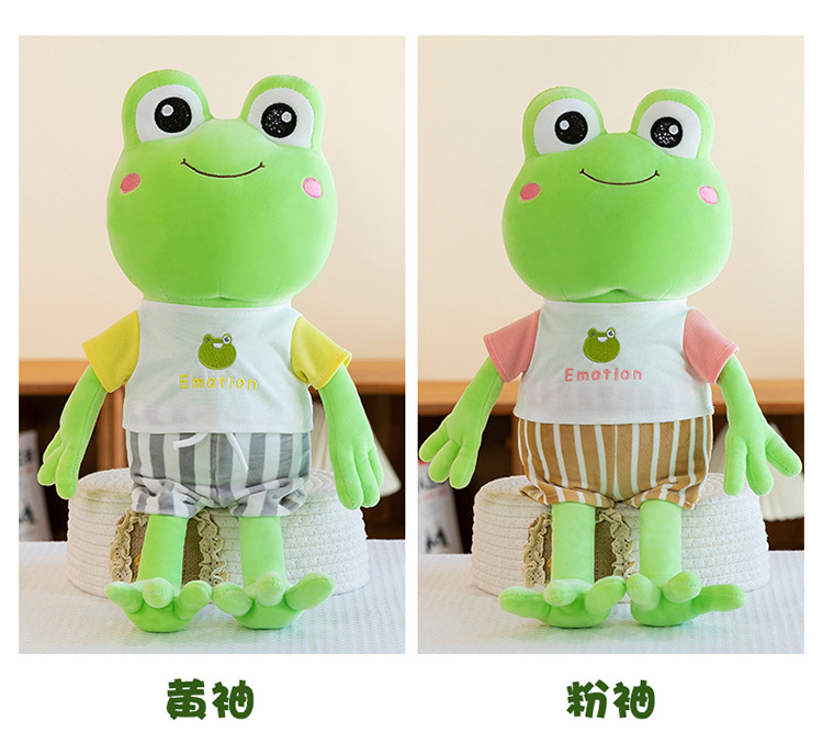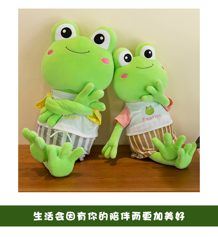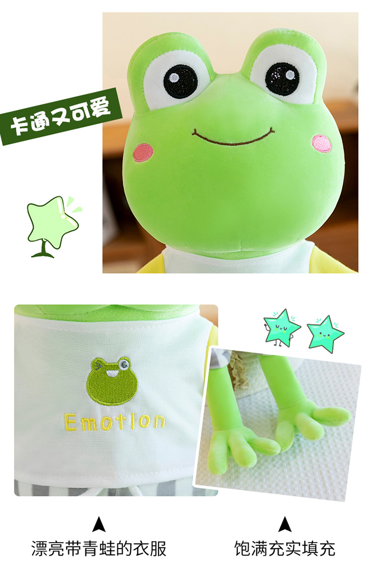 かわいい夏のカエルのぬいぐるみの子供たちは、子供のソファをなだめて、オフィス人形の誕生日プレゼントを飾っています