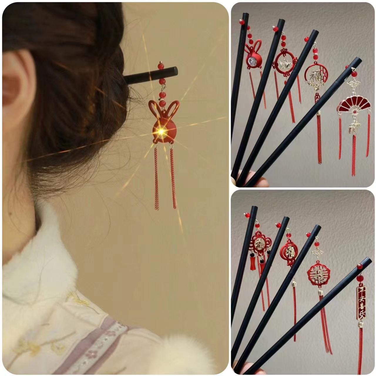 新年の赤いフリンジのかんざしの新しい中国式のチャイナドレスのかんざしの高級感の中秋の木のかんざしの古風な漢服のヘアピンの髪飾り