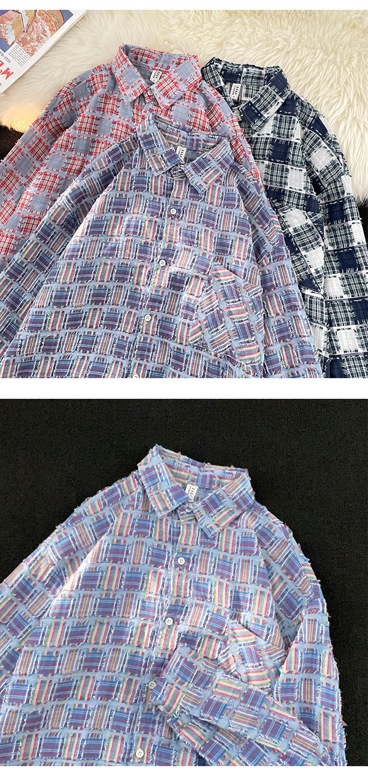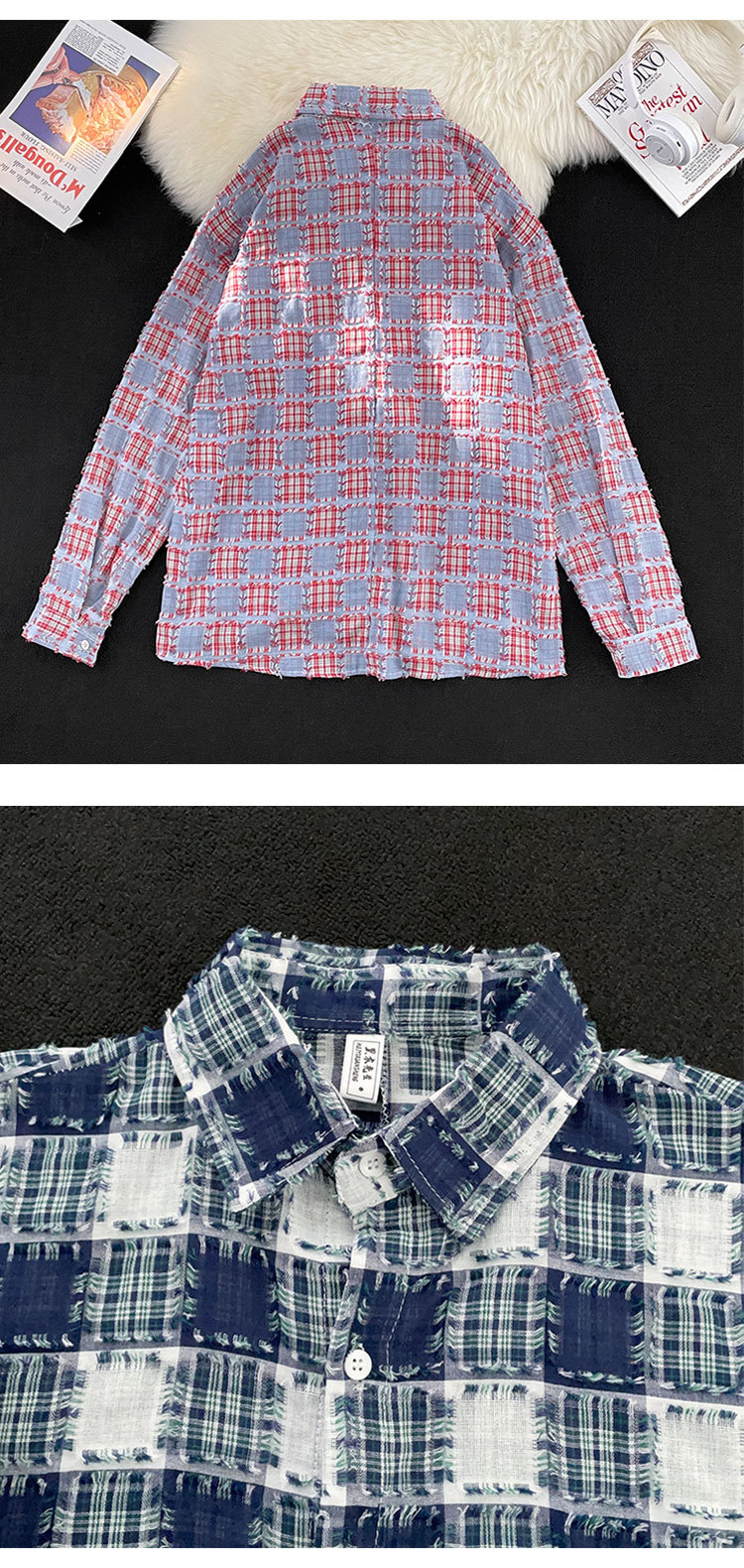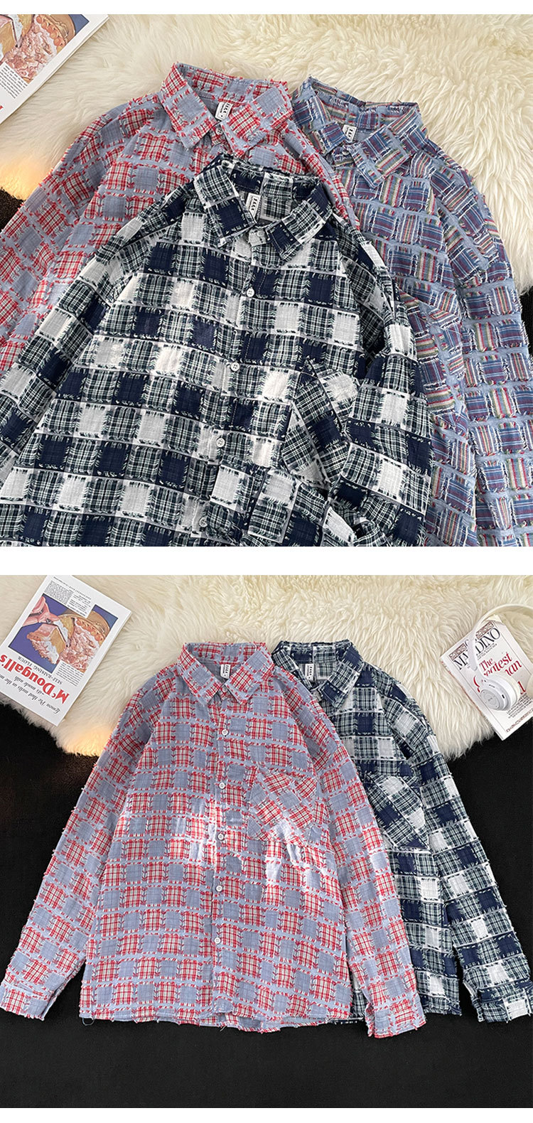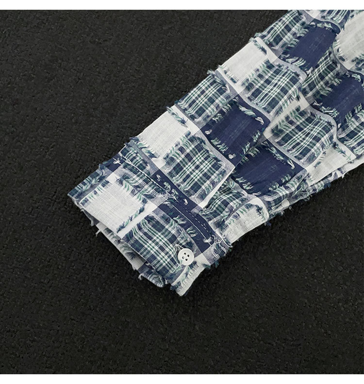 ファッションブランドの格子のフリンジシャツの男性の長袖の春秋のゆったりしている百合のカップルの金の寸の服のカジュアルなシャツの上着