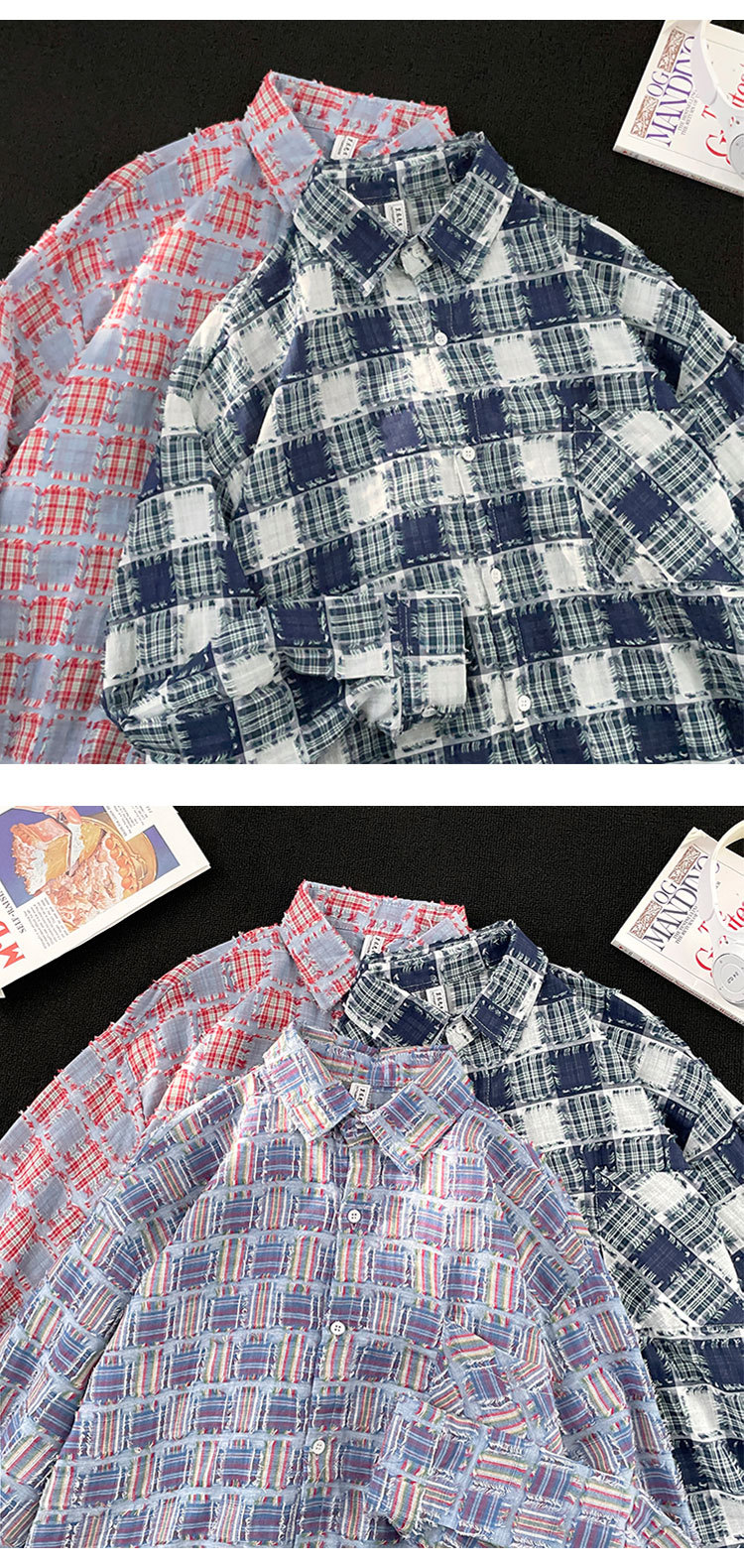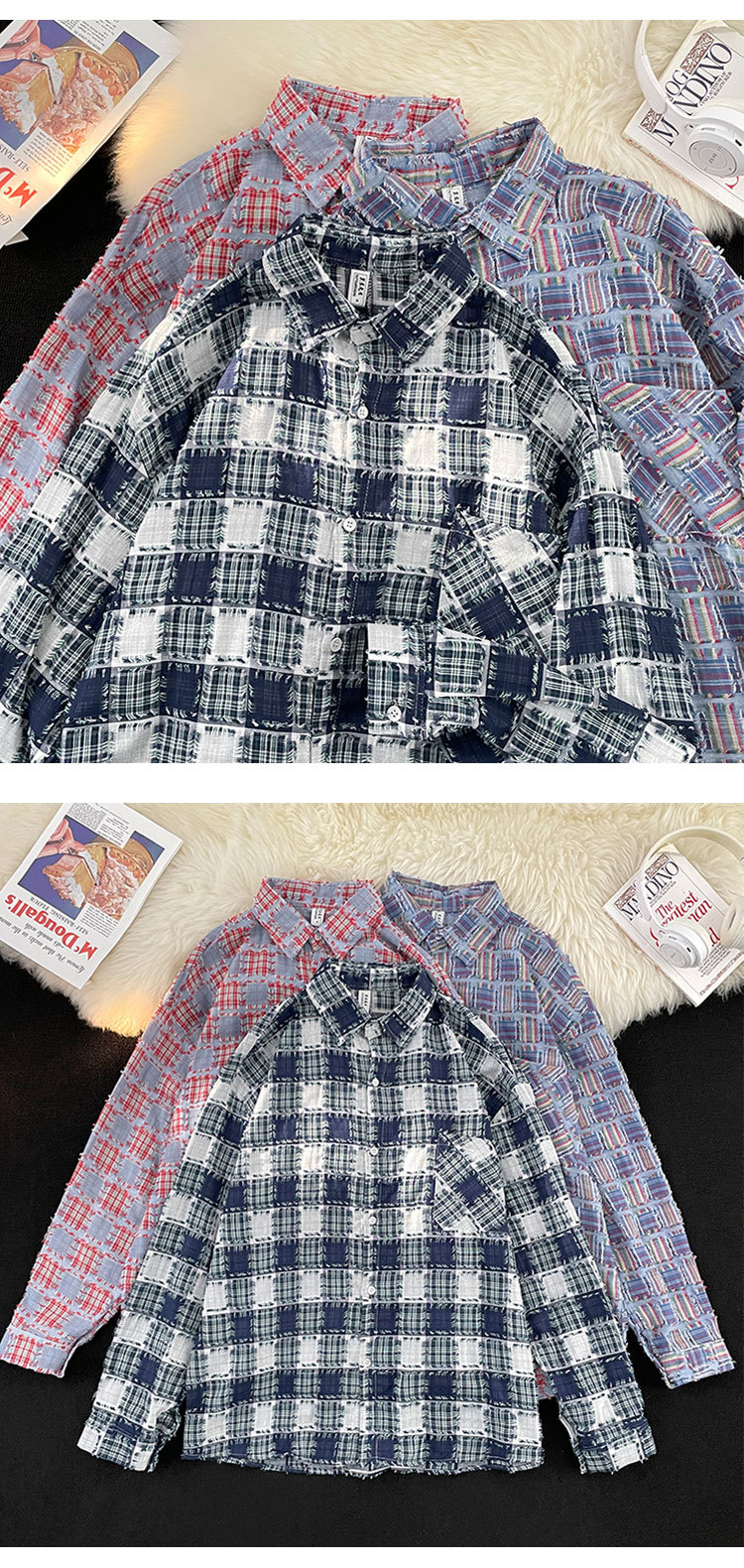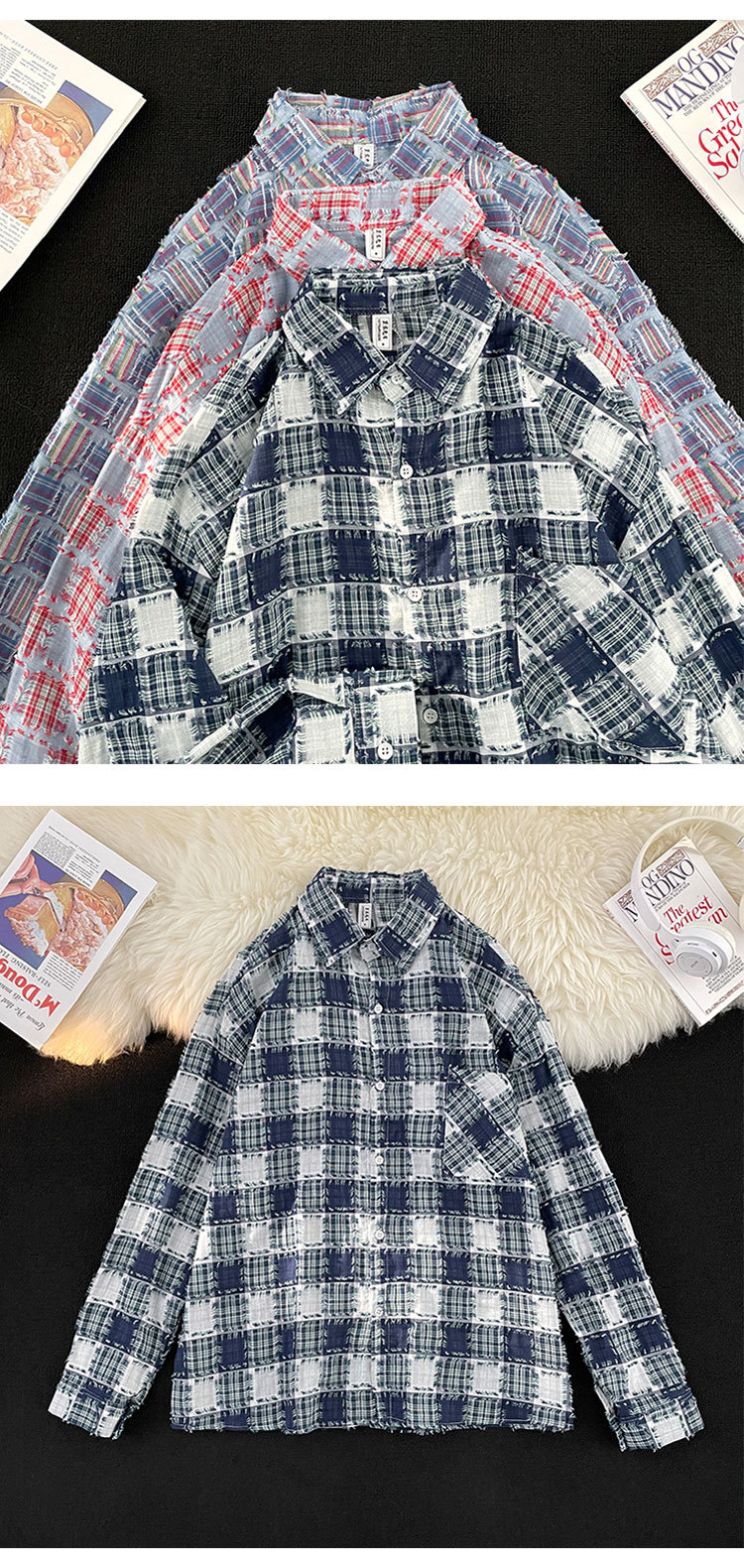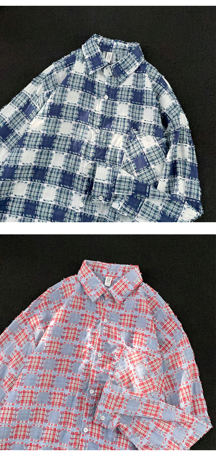 ファッションブランドの格子のフリンジシャツの男性の長袖の春秋のゆったりしている百合のカップルの金の寸の服のカジュアルなシャツの上着