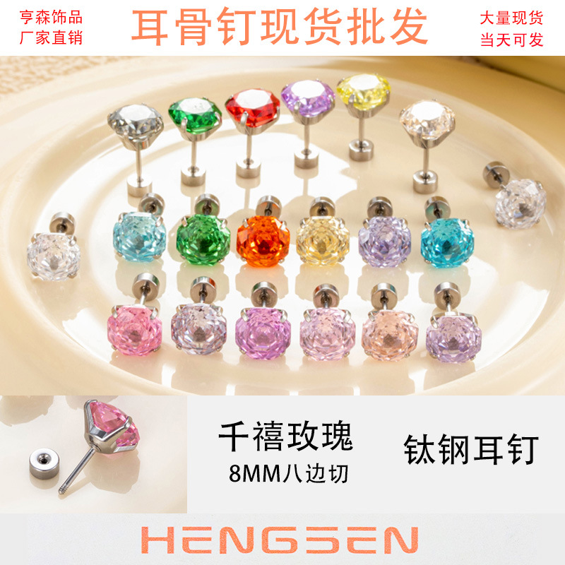 Hengsen ハイエンド 6 ミリメートル 8 面ミレニアムローズカットジルコンイヤリング細いロッドチタン鋼ネジ耳骨牛爪