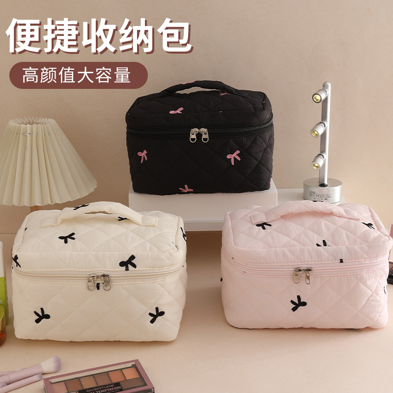 大容量棉绗缝蝴蝶结便携手提化妆包耳机数据线化妆品收纳包洗漱包