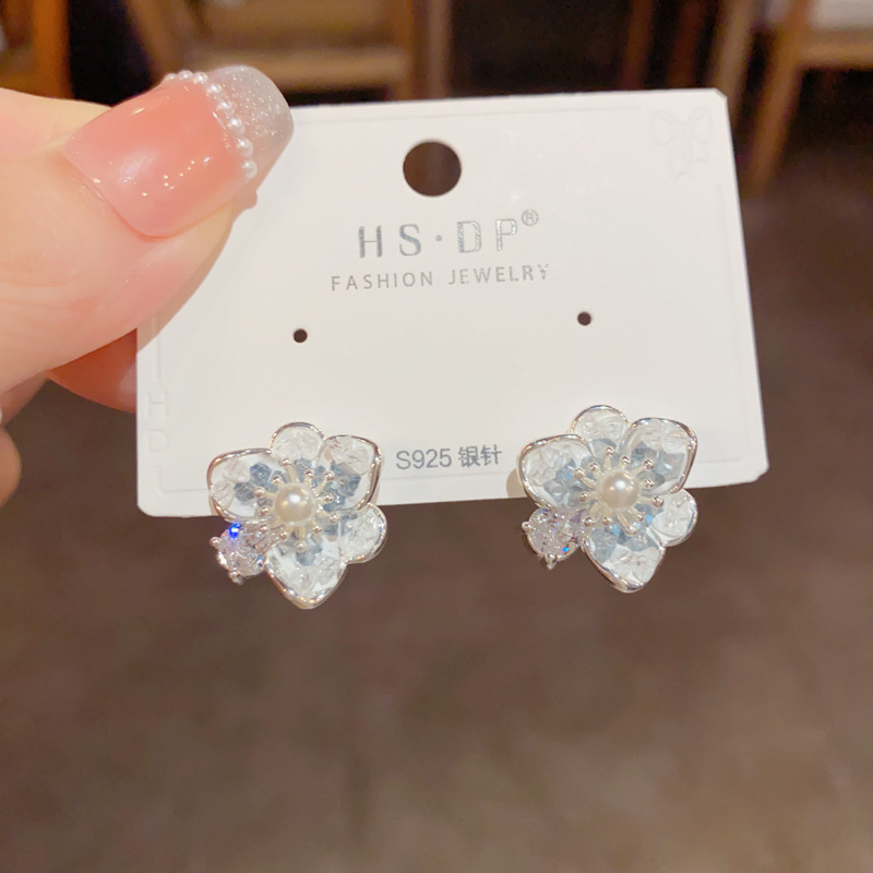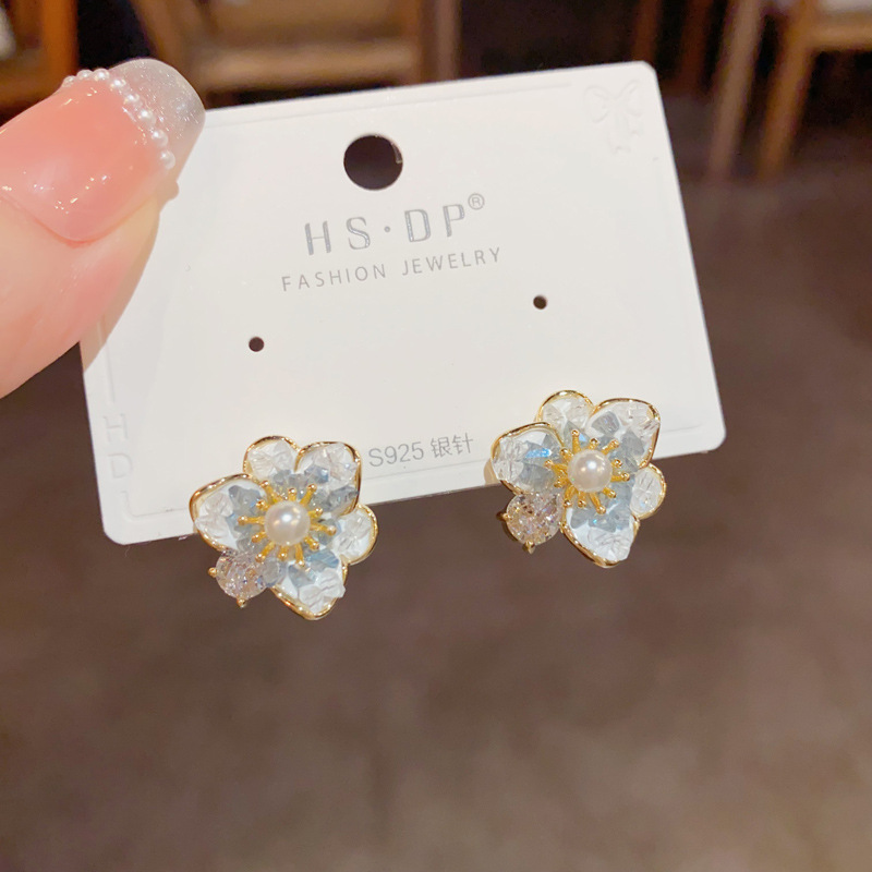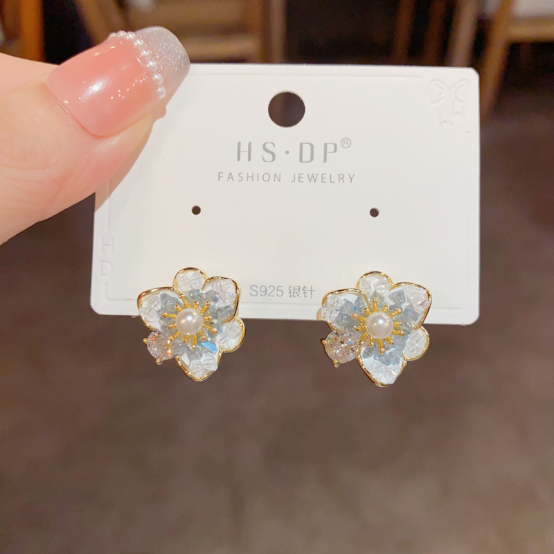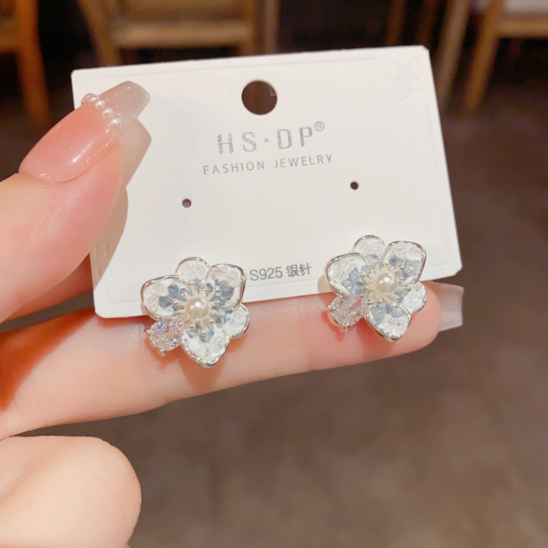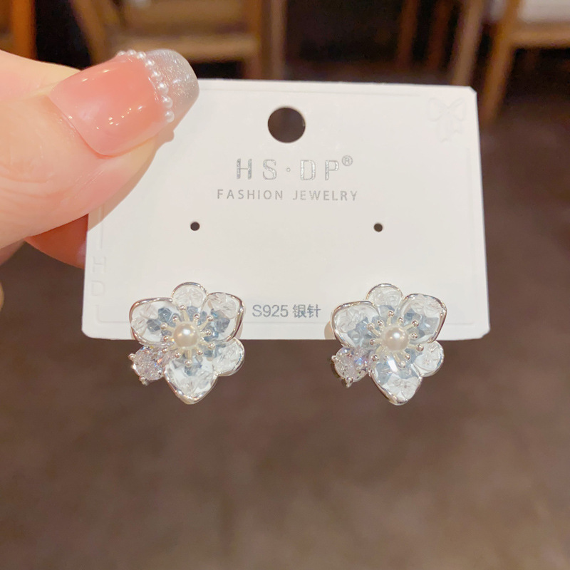 小清新ファッション甘美百合水晶真珠花ピアスs925銀針気質シンプルで洗練されたイヤリング女