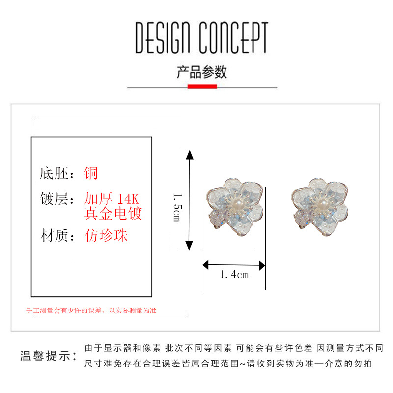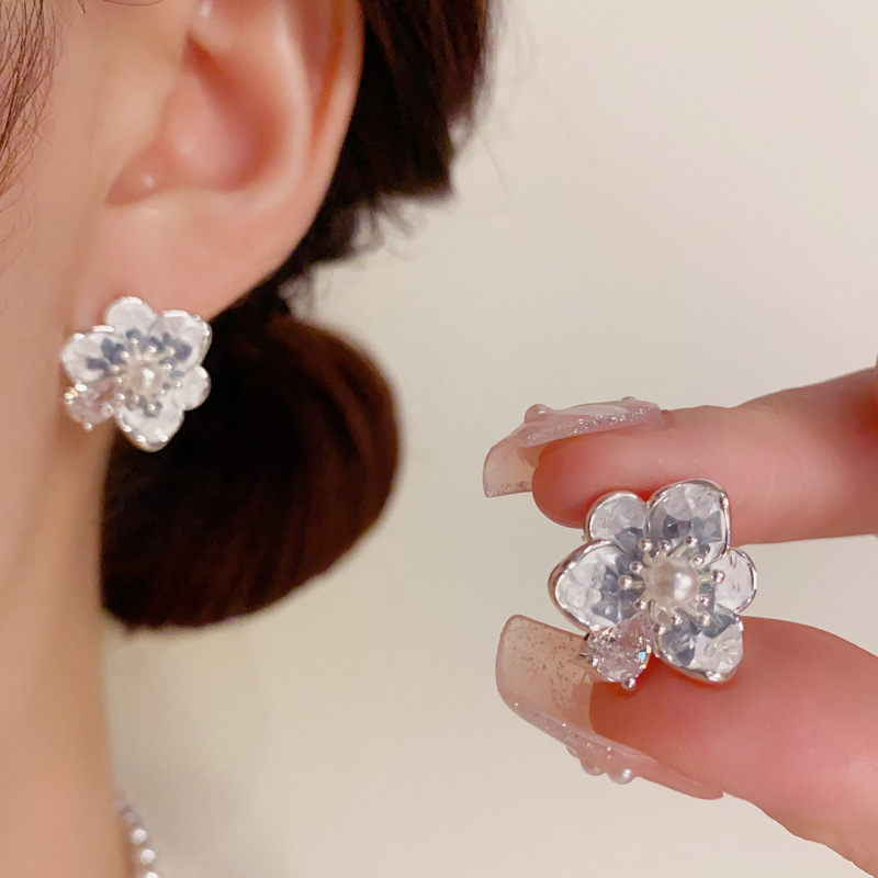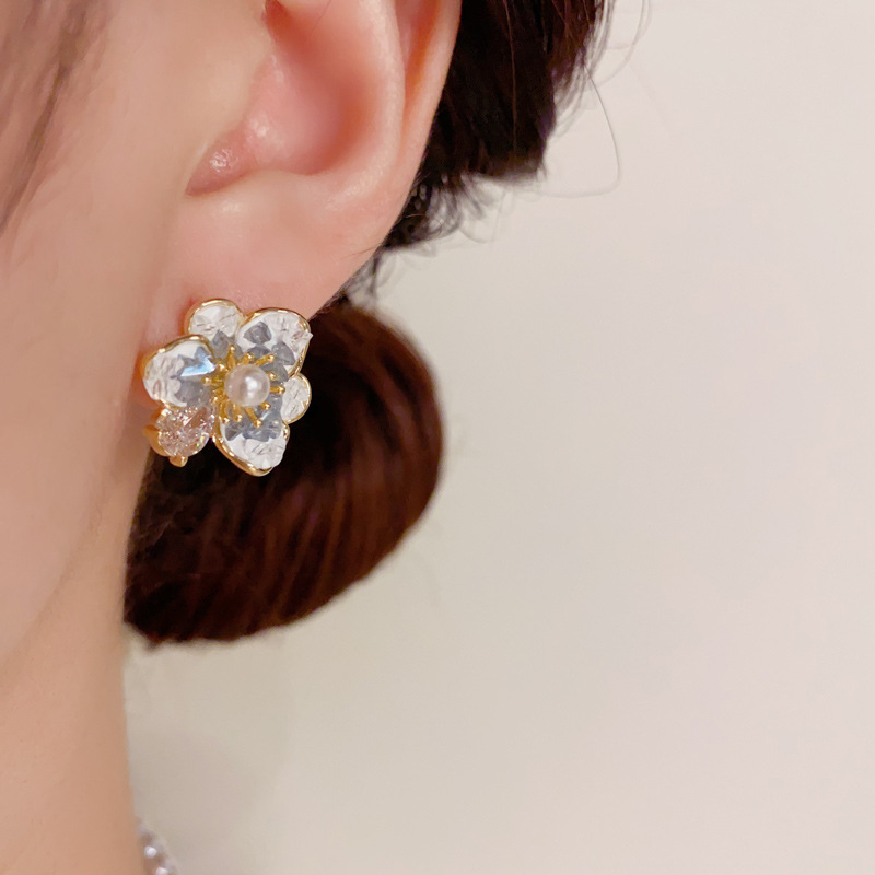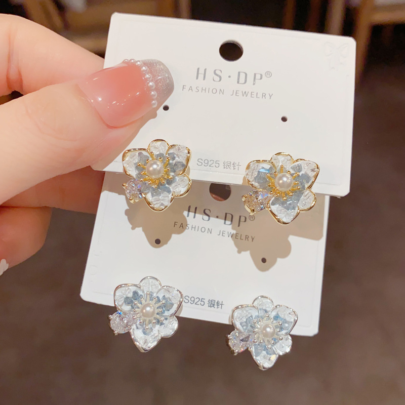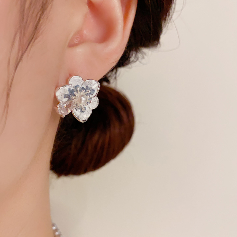 フランスの軽くて豪華なジルコン真珠のツバキの花のピアスの気質のファッションの高級感の甘い百合の銀の針のイヤリングの卸売り