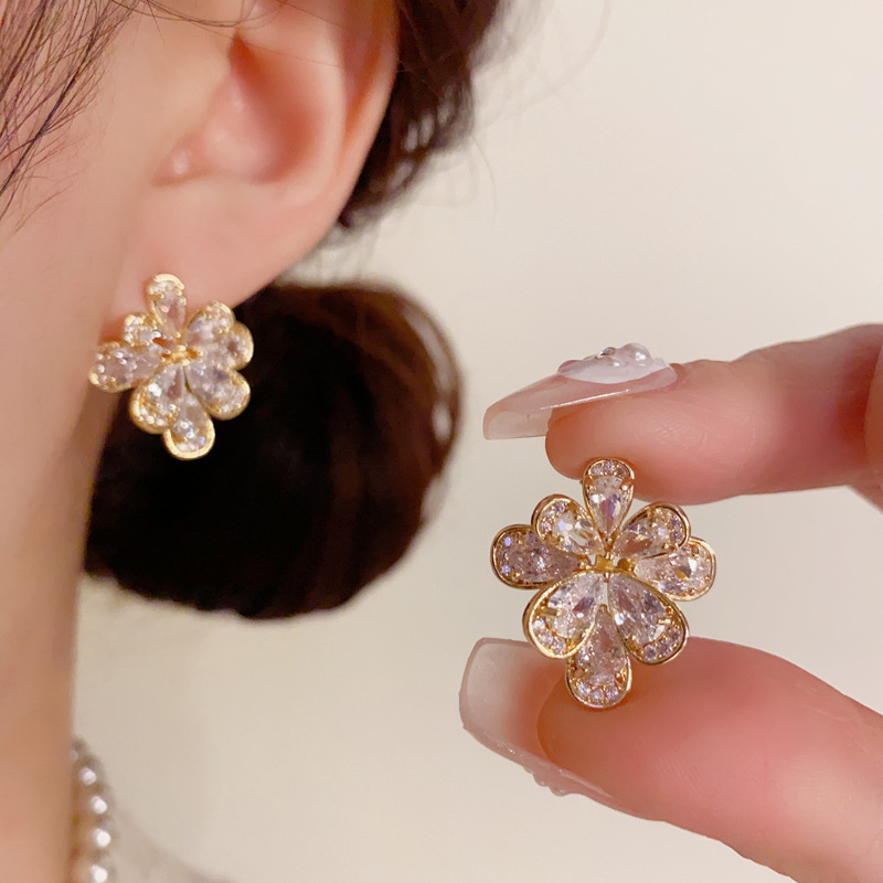 S925銀針ジルコン漆山茶花ピアス高級感大気百合イヤリングファッション軽贅沢耳飾り卸売り
