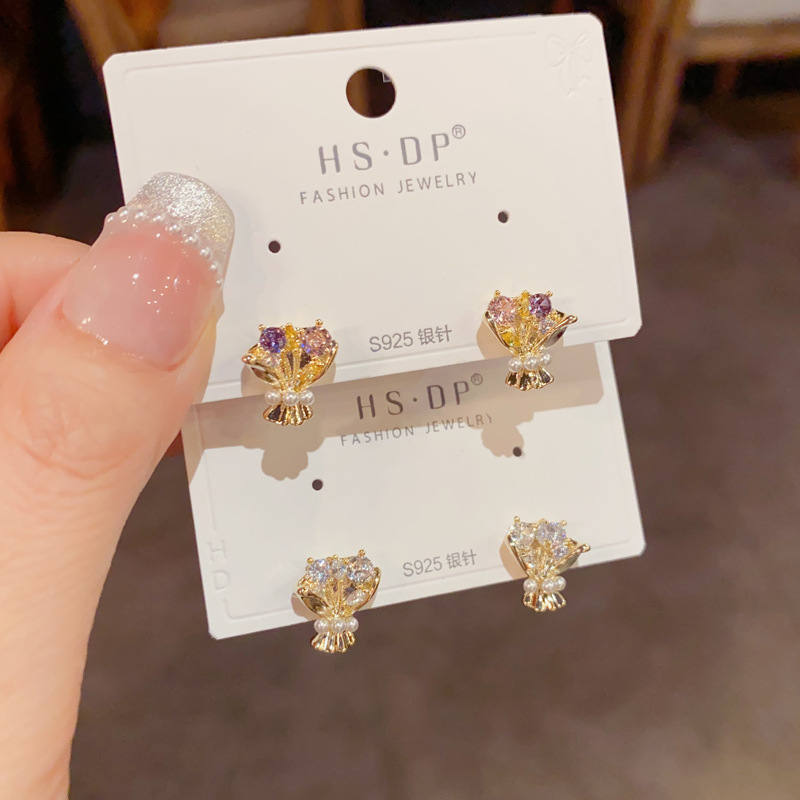 s925 シルバー針ニッチ絶妙なファッション甘い多用途フルダイヤモンドパールブーケイヤリングライト高級コンパクトイヤリング