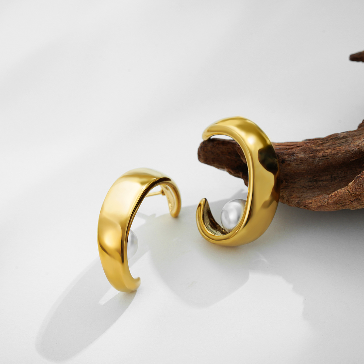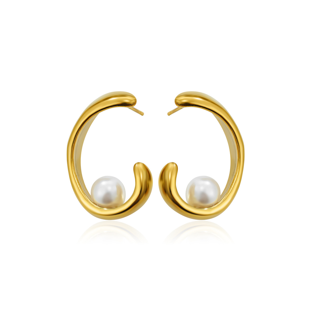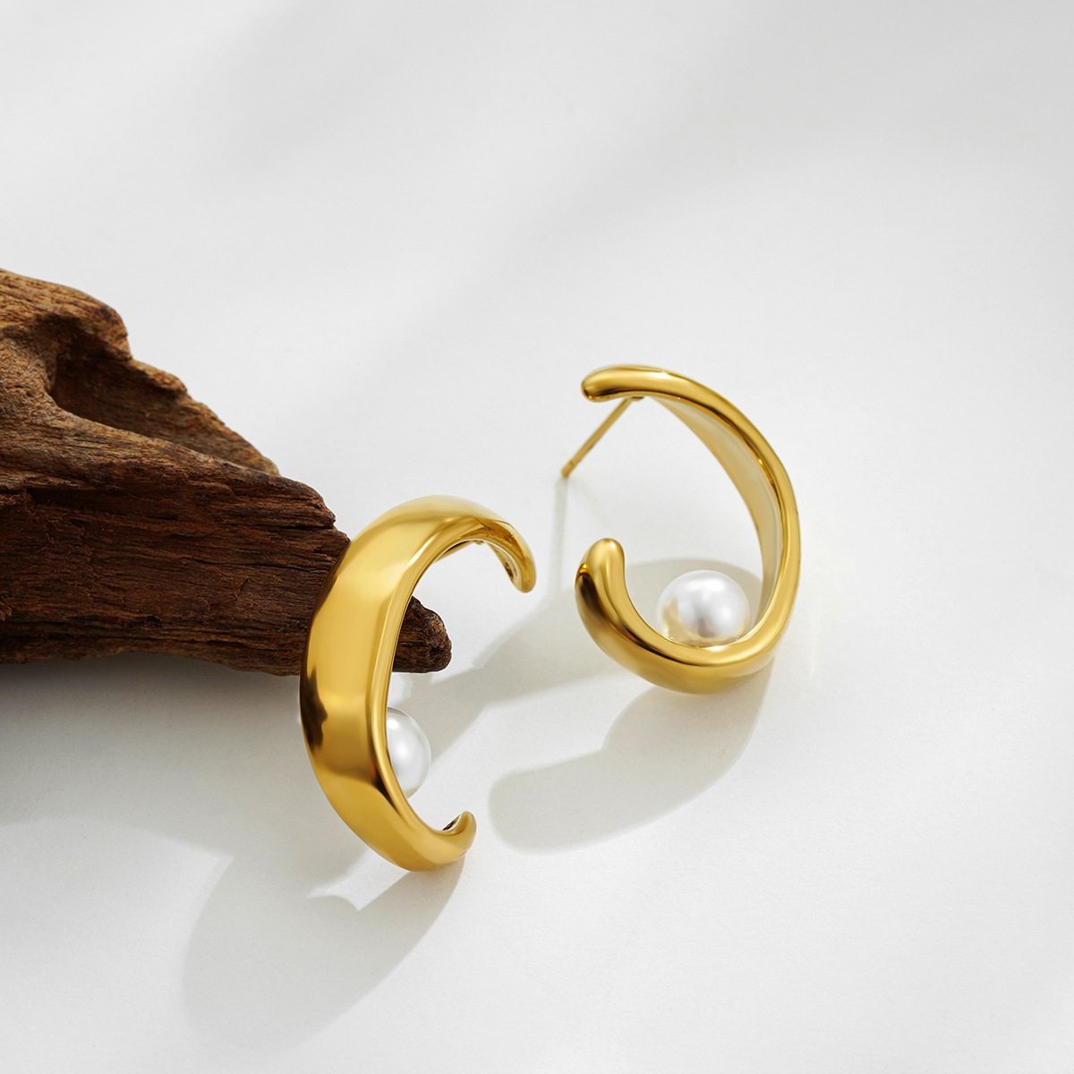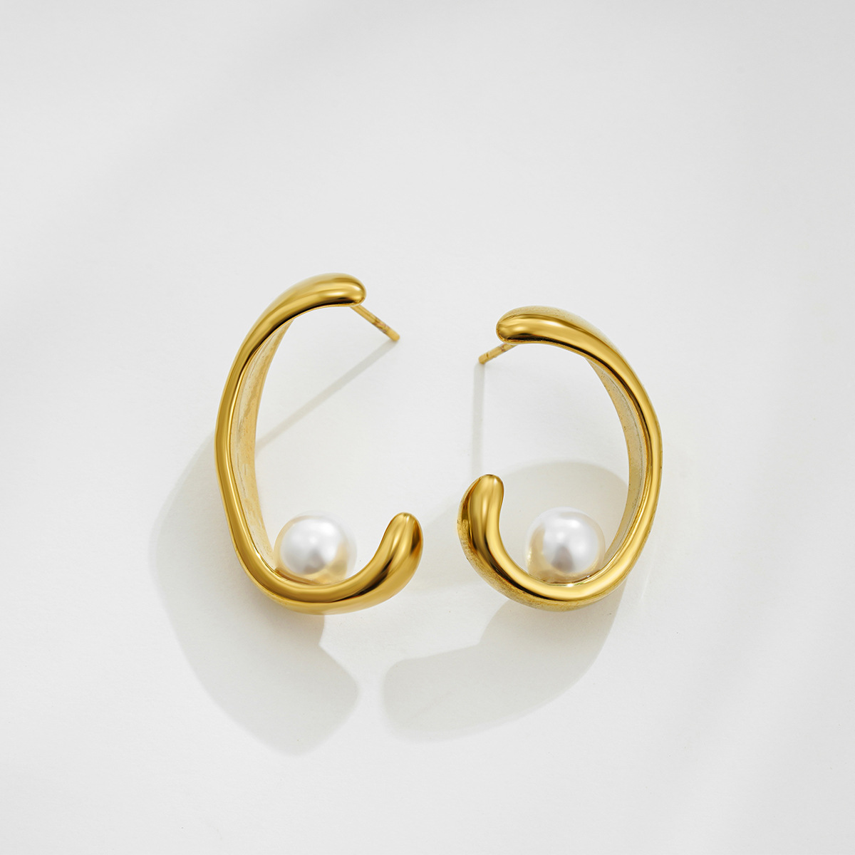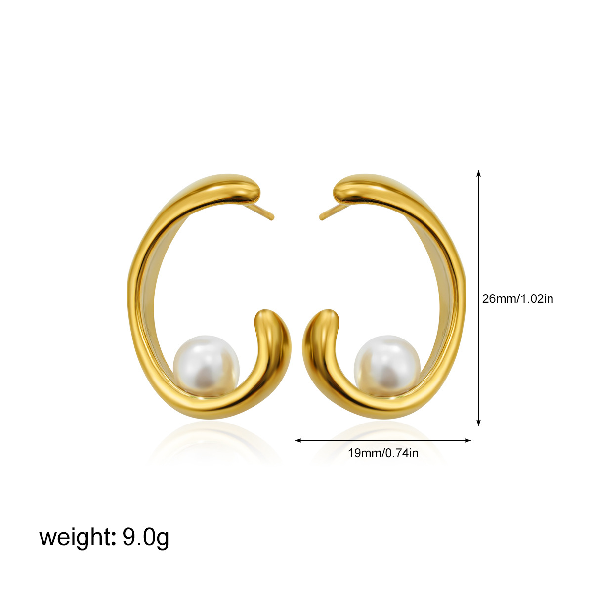 欧米の越境ファッションの個性C形の不規則なデザインのイヤリングのステンレスの真金の電気めっきの空は真珠のピアスを支えます。