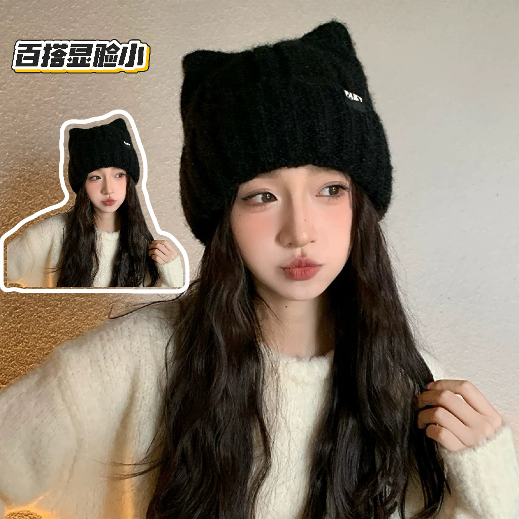 秋冬新款甜美可爱猫耳针织帽子女冬季韩版套头毛线帽百搭加绒保暖