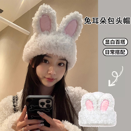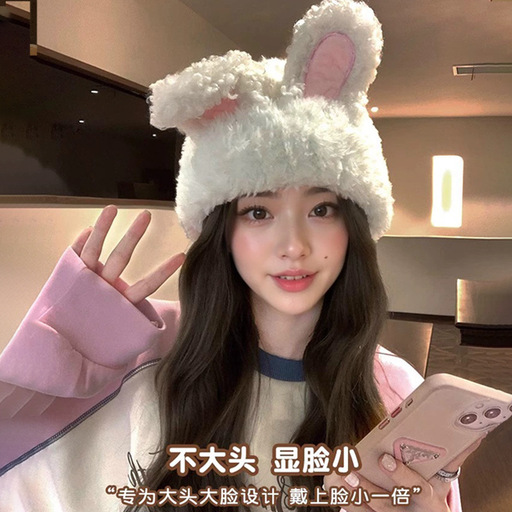 日系可爱毛绒兔耳朵帽子女秋冬季保暖针织帽护耳套头显脸小针织帽