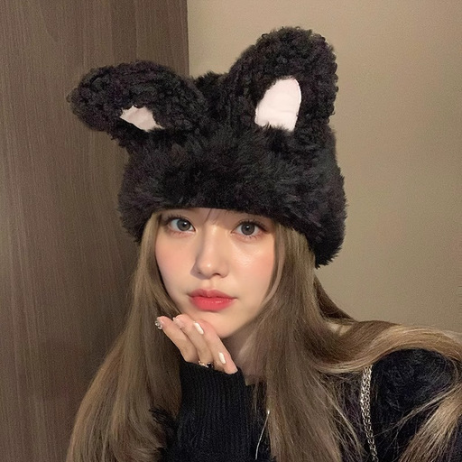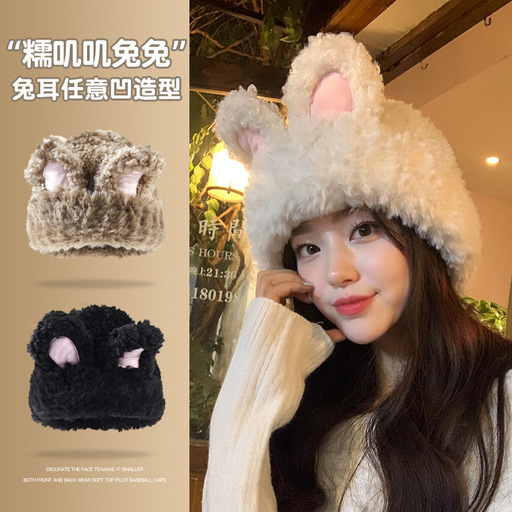 秋冬韩版新款可爱甜美兔耳朵毛绒帽子女保暖防寒毛线帽百搭针织帽