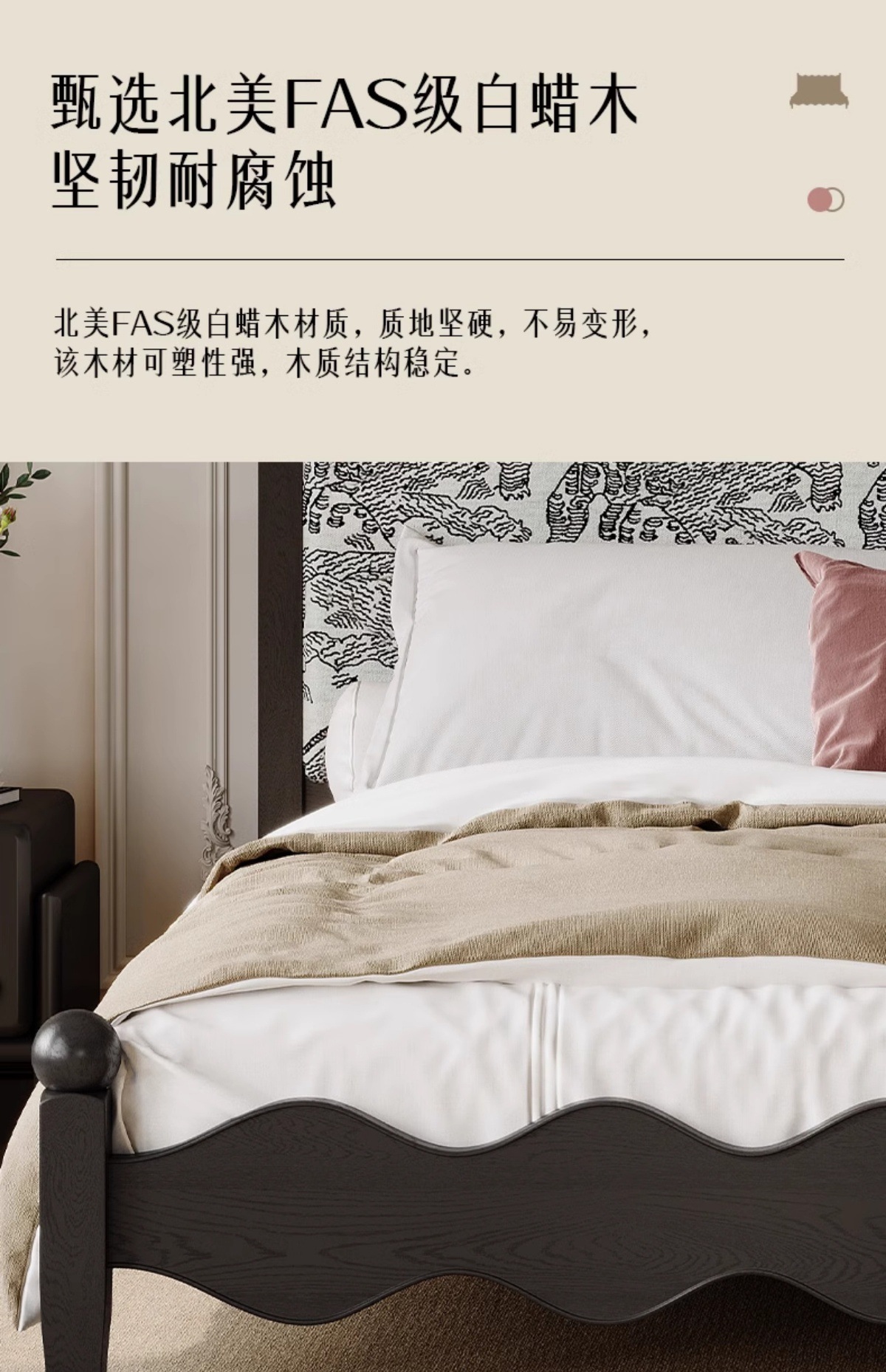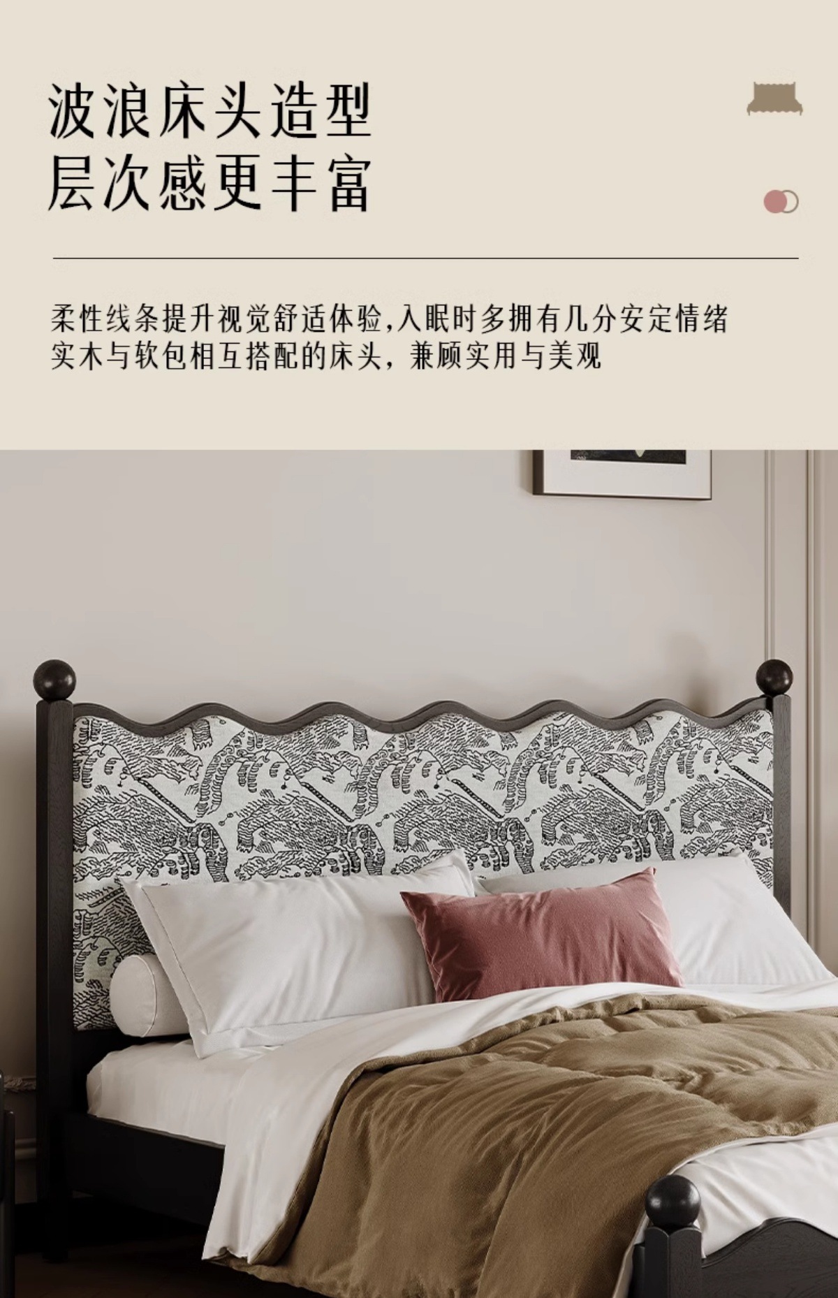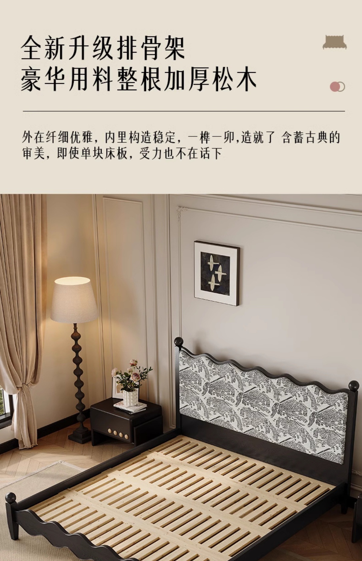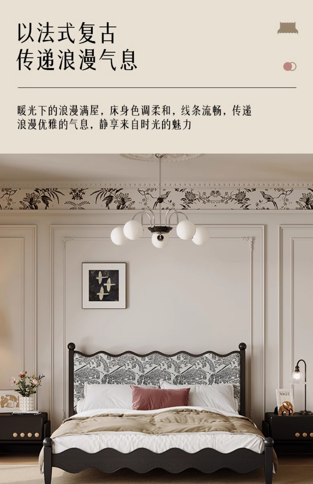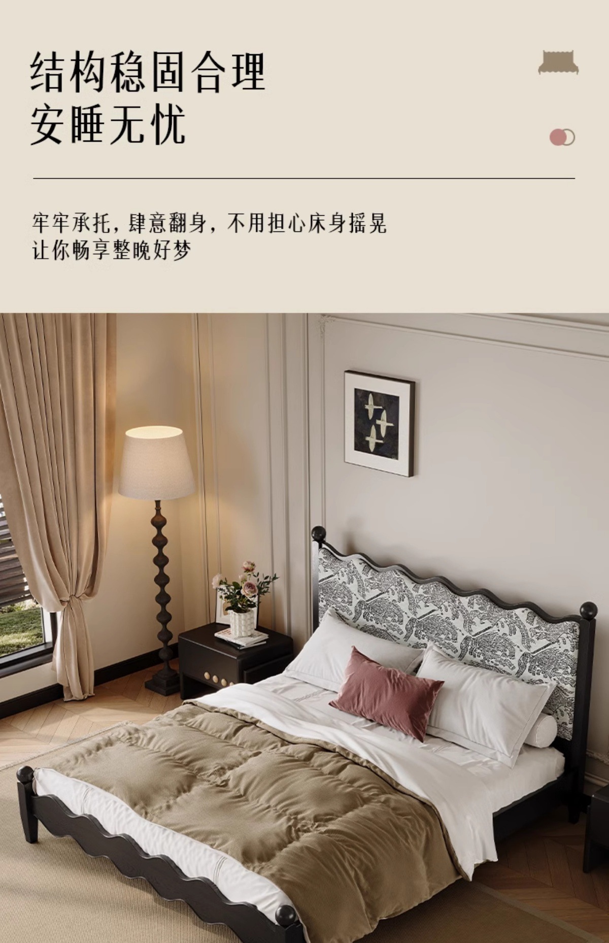 ULLLOフランス復古ベッド実木ツインベッド1.8メートル主臥ジャカード布芸黒波白蝋木ベッド