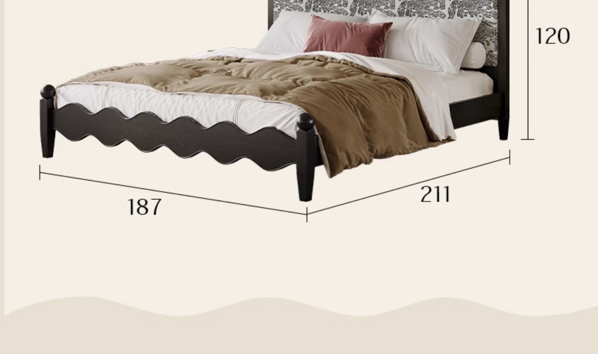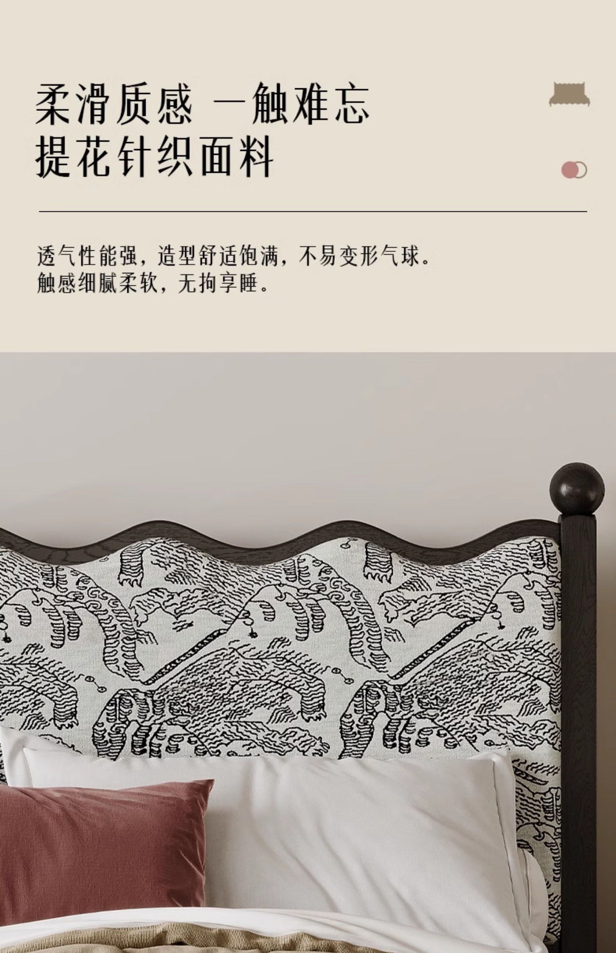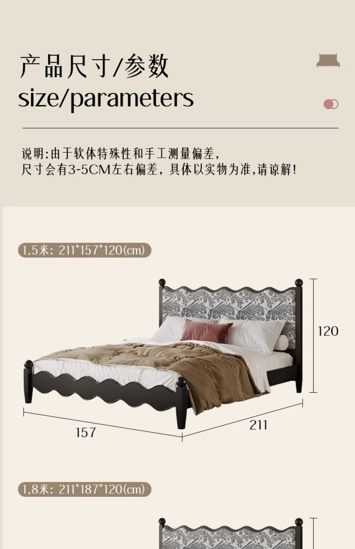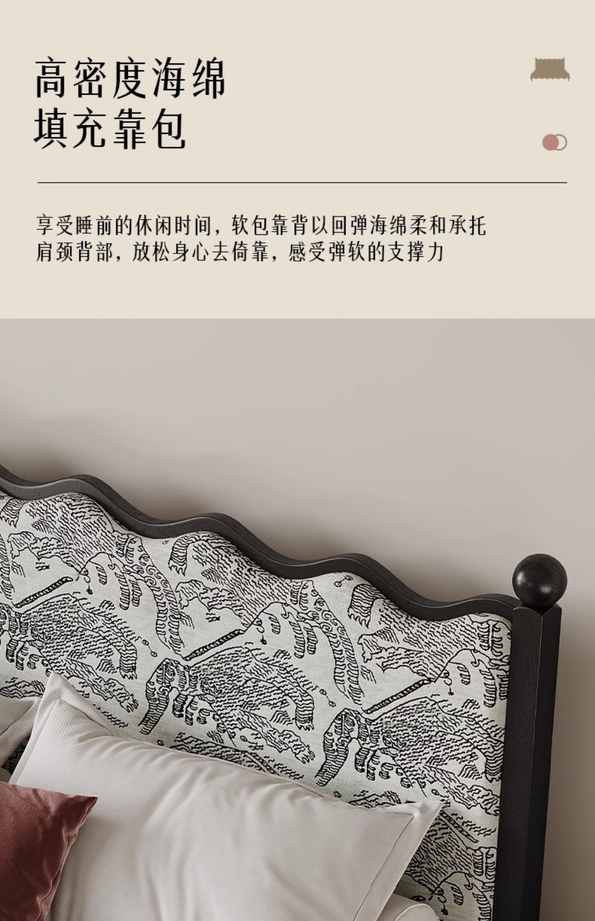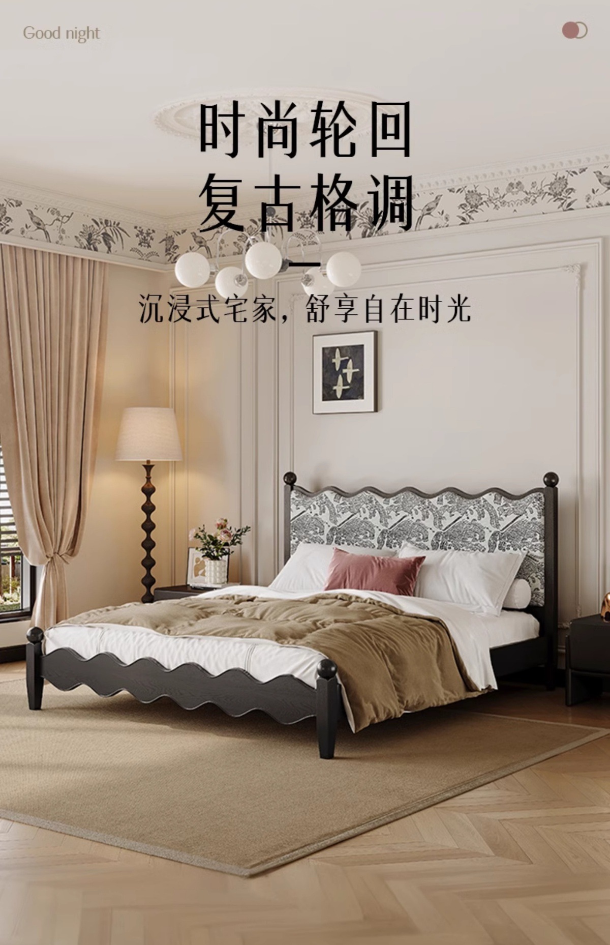 ULLLOフランス復古ベッド実木ツインベッド1.8メートル主臥ジャカード布芸黒波白蝋木ベッド