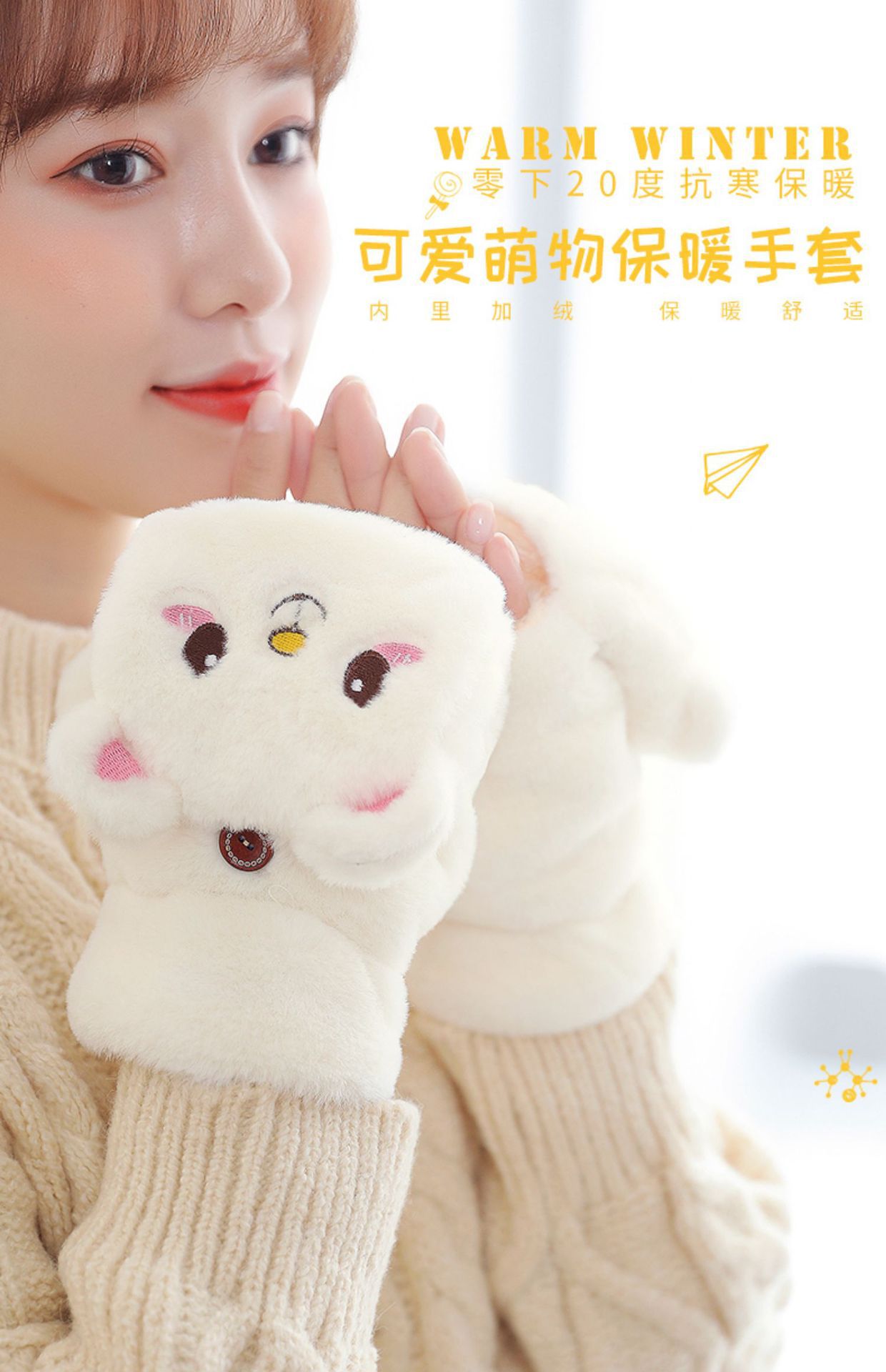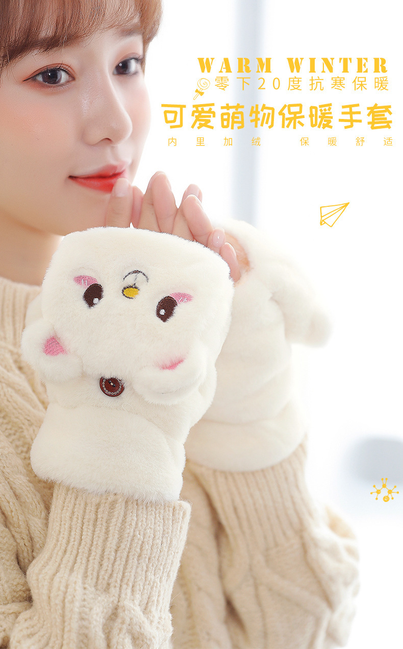 熊猫翻盖半指手套冬可爱毛茸加绒加厚保暖卡通女学生写字骑车百搭