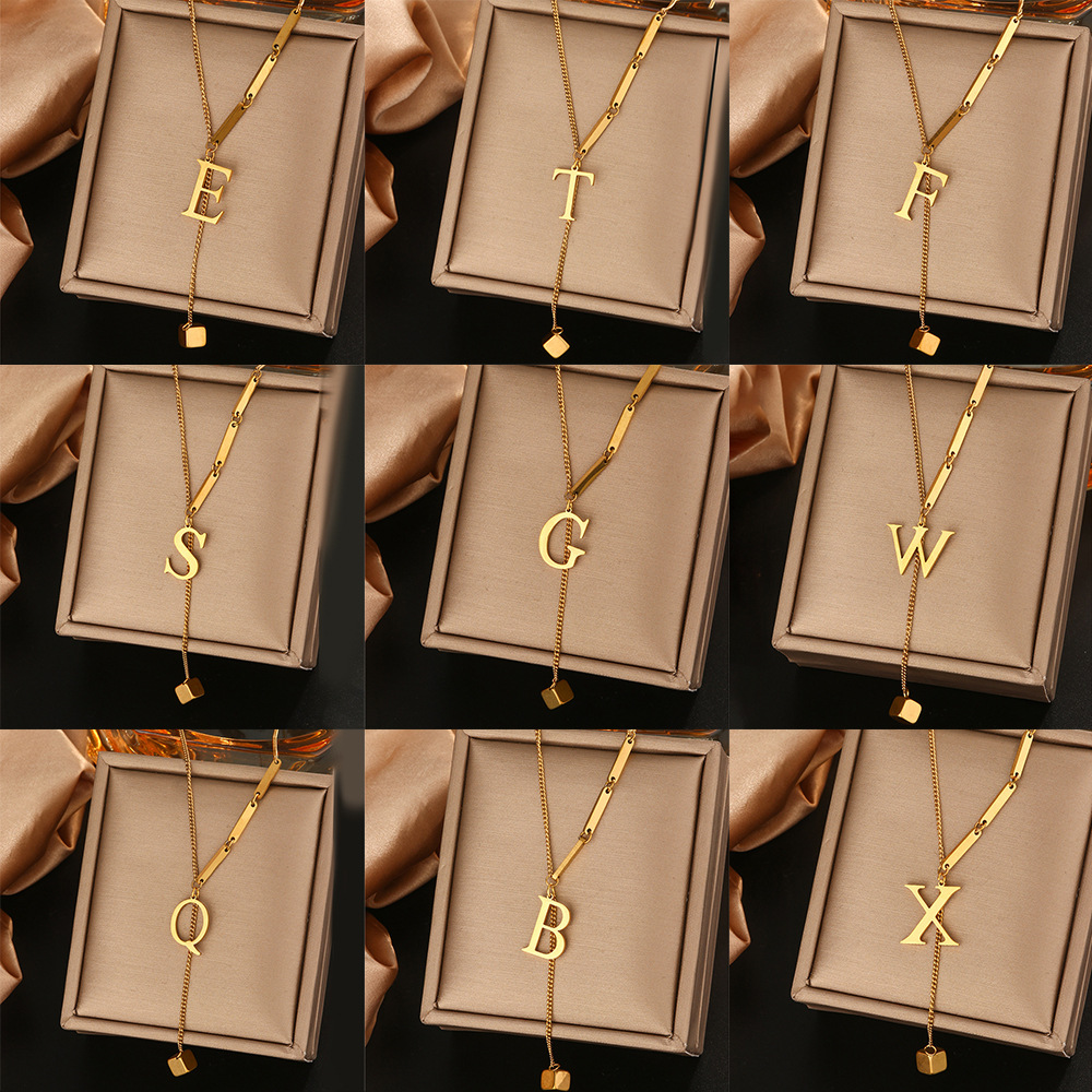 ファッションのシンプルな小衆のネックレスのアクセサリーのステンレスのフリンジの26文字の小さい四角のペンダントの個性の気質のアクセサリー