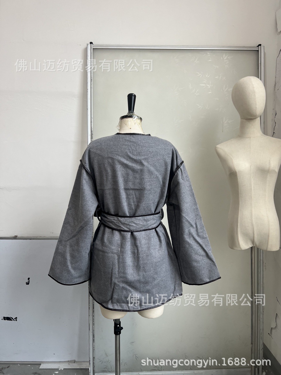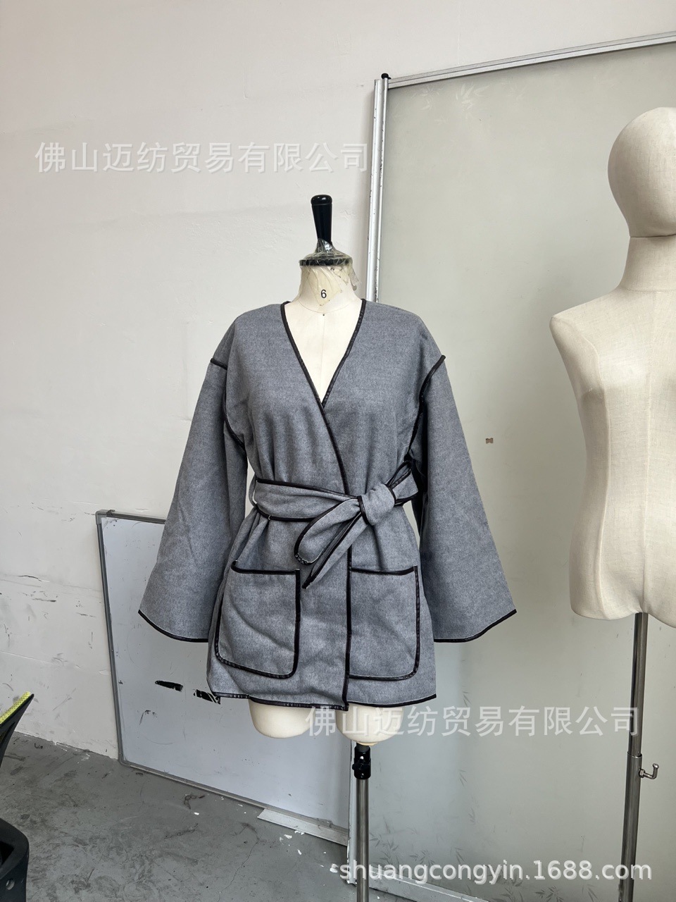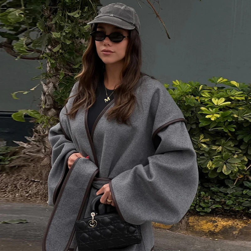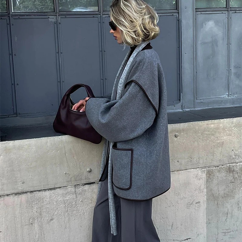 在庫あり - 欧米風2026年春婦人服ショートコート、エレガントでヴィンテージなグレーの女性用ベルト付きコート