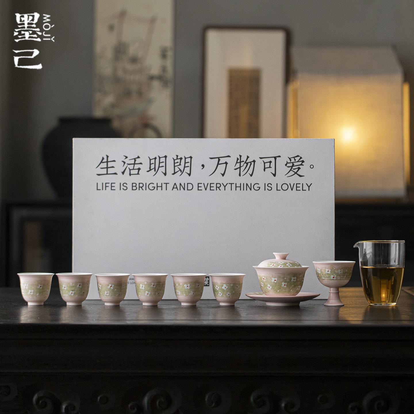 墨己蒼煙紅手描きセット茶器セット家庭用蓋碗セット文人器桃花ピンク茶器