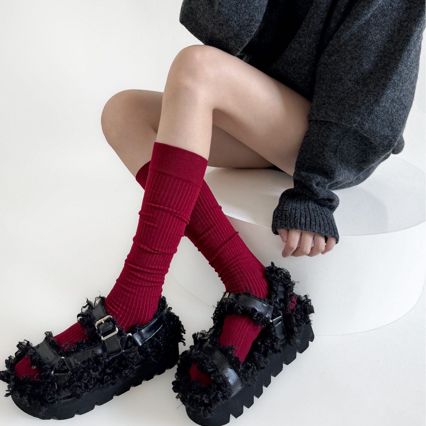 秋の新作 薄手 パッチワーク カーフソックス ロールアップアンコラレッド ソフト フラット ミドル丈ソックス ウール パイルソックス