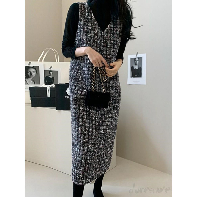 韩国chic秋季复古小香风V领外贸女装宽松休闲粗花呢背心连衣裙女