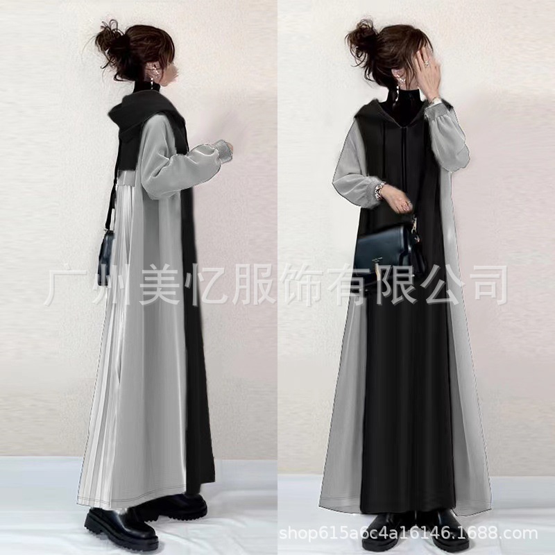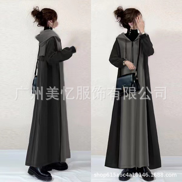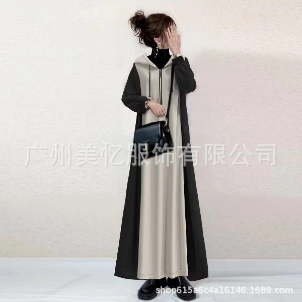 现货2025跨境秋季热卖长裙连帽拼色长款连衣裙