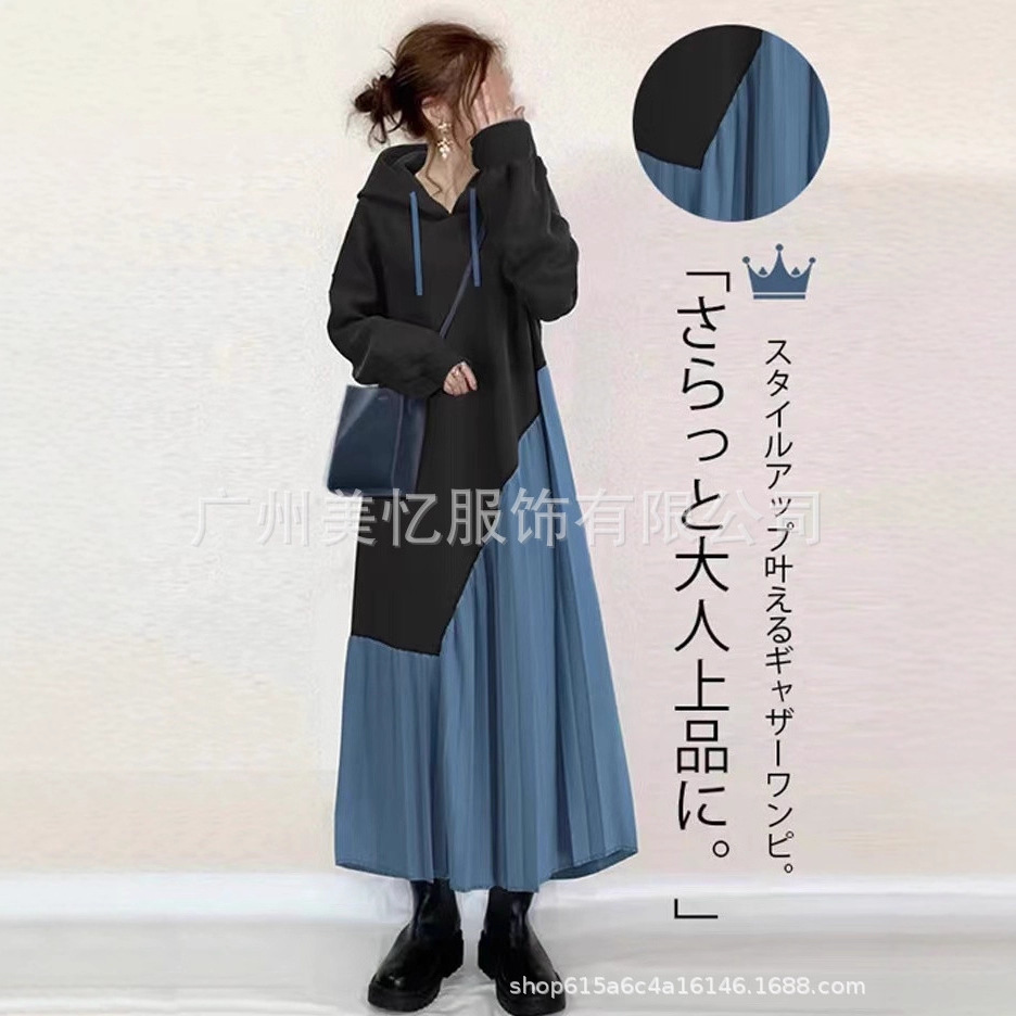 スポット 2025 クロスボーダー春と秋の売れ筋フード付き不規則なカラーマッチングロングスウェットシャツルーズドレス