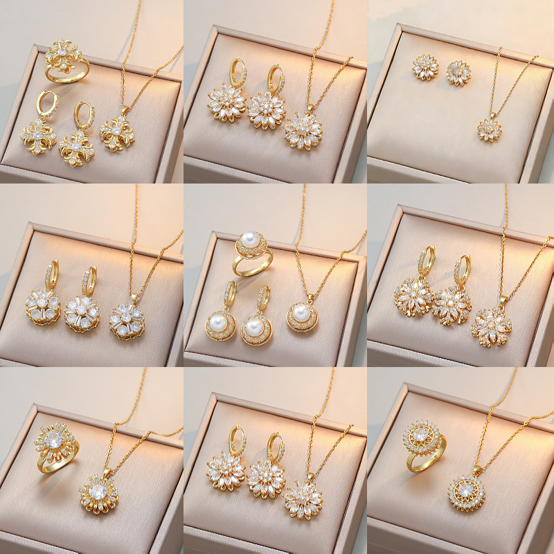 项链女 网红同款跨境向日葵花朵锆石旋转三件套套装饰品钛钢项链