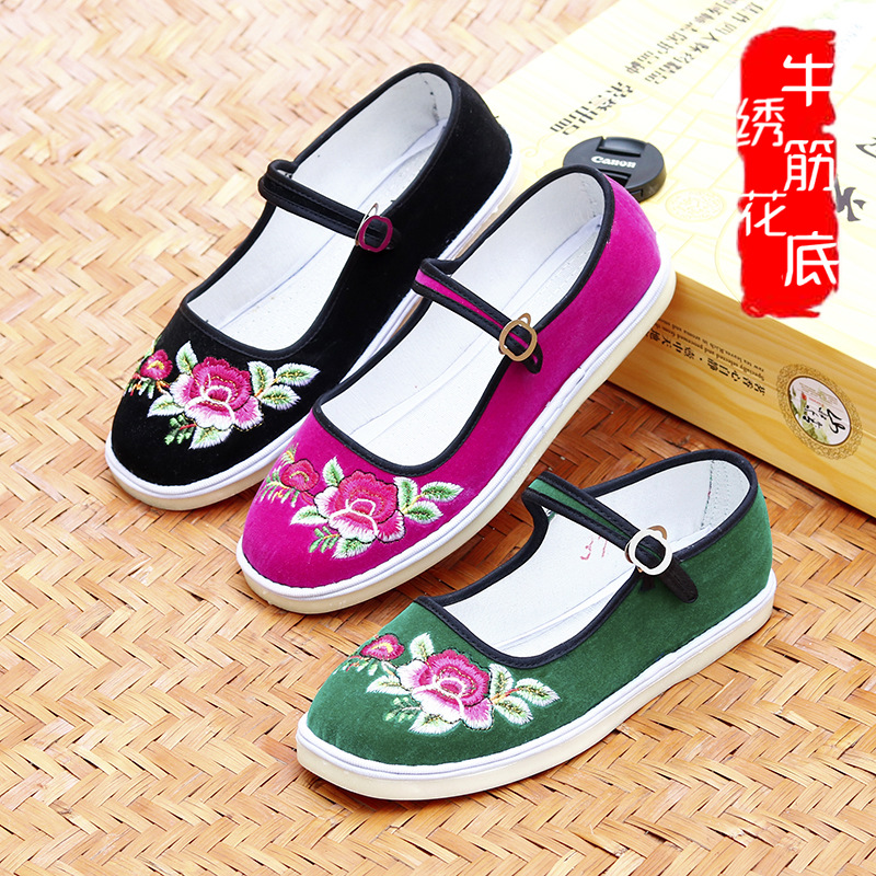 牛の筋肉の底の古い北京の刺繍の布の靴の手の上の線の1字は女性の復古の刺繍の民族の風の平底の卸売りを持ちます。