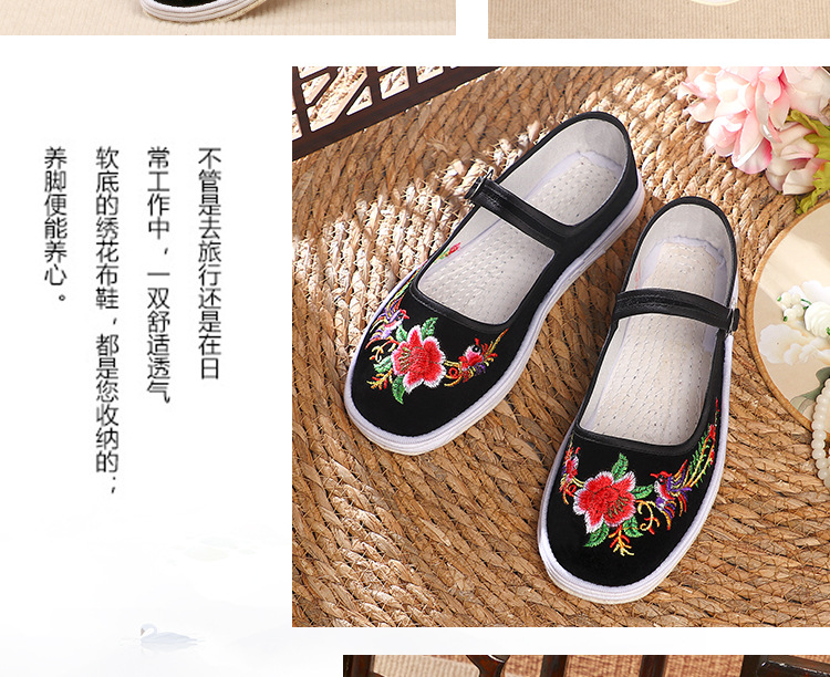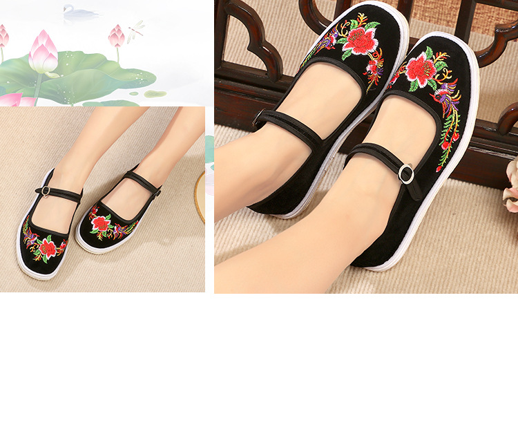 民族風の刺繍の布の靴の手作りの線は黒い布の靴の女性の1字を掛けて広場の舞の牛の筋肉の底の鳳凰の花を持ちます。