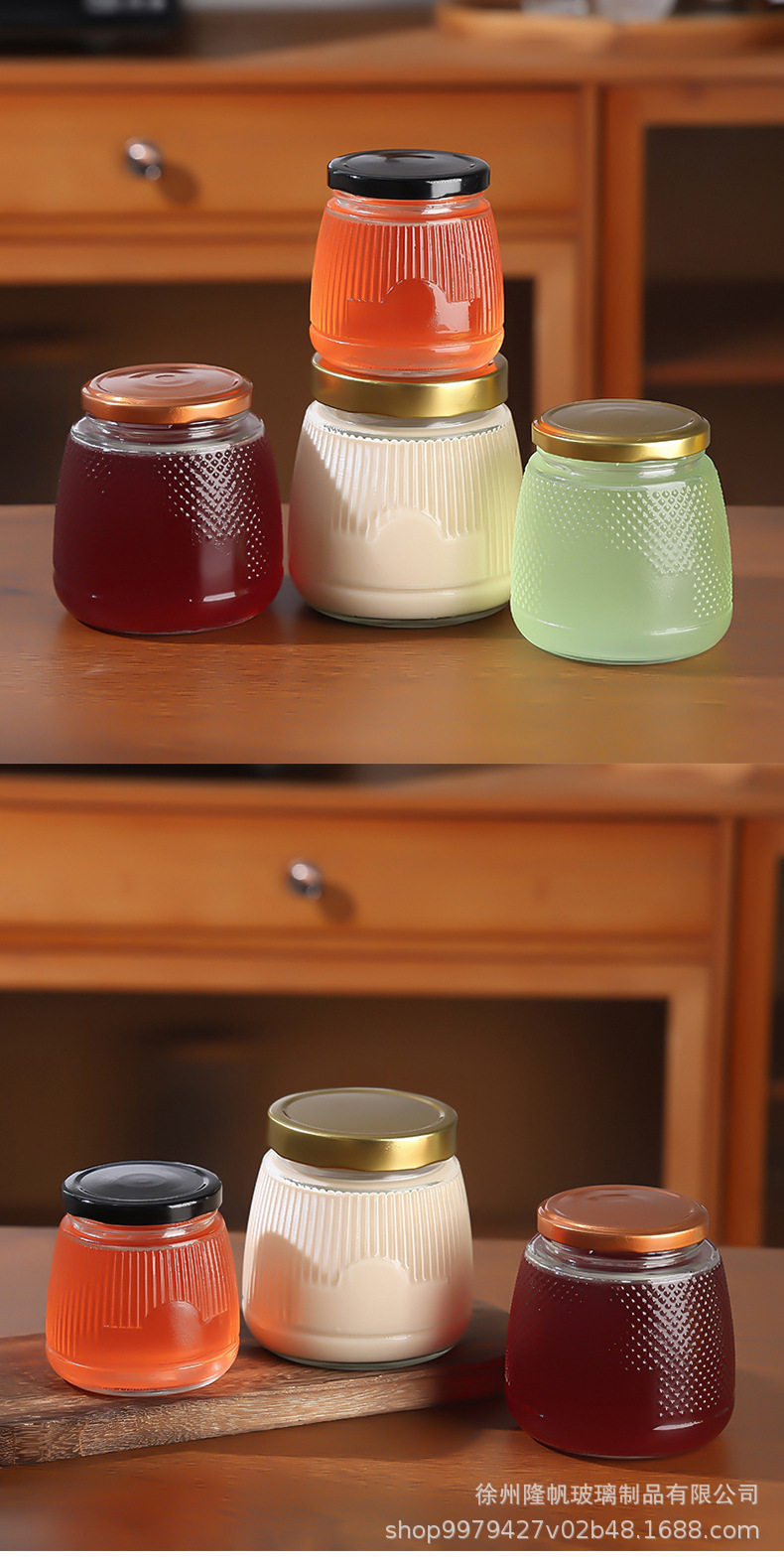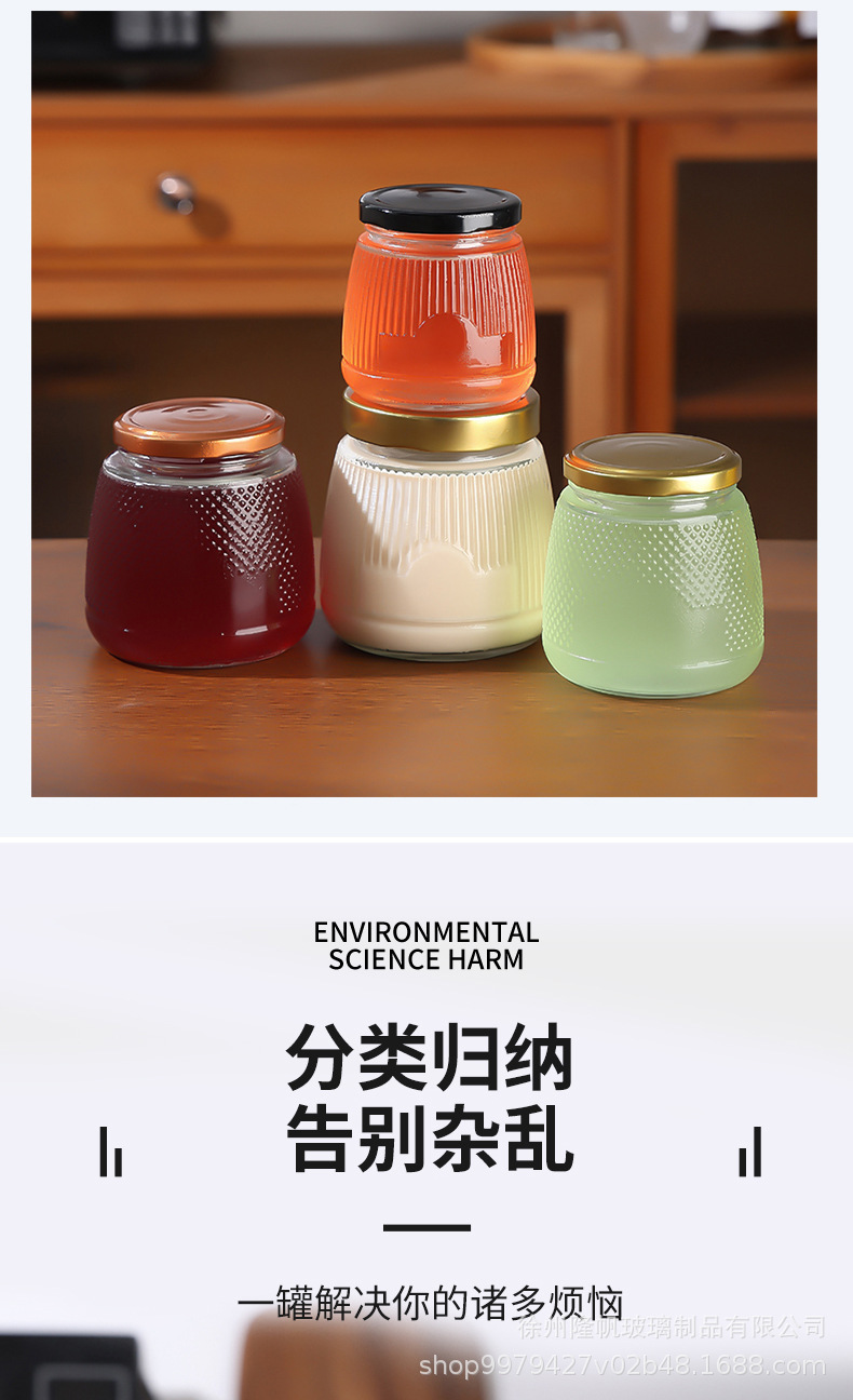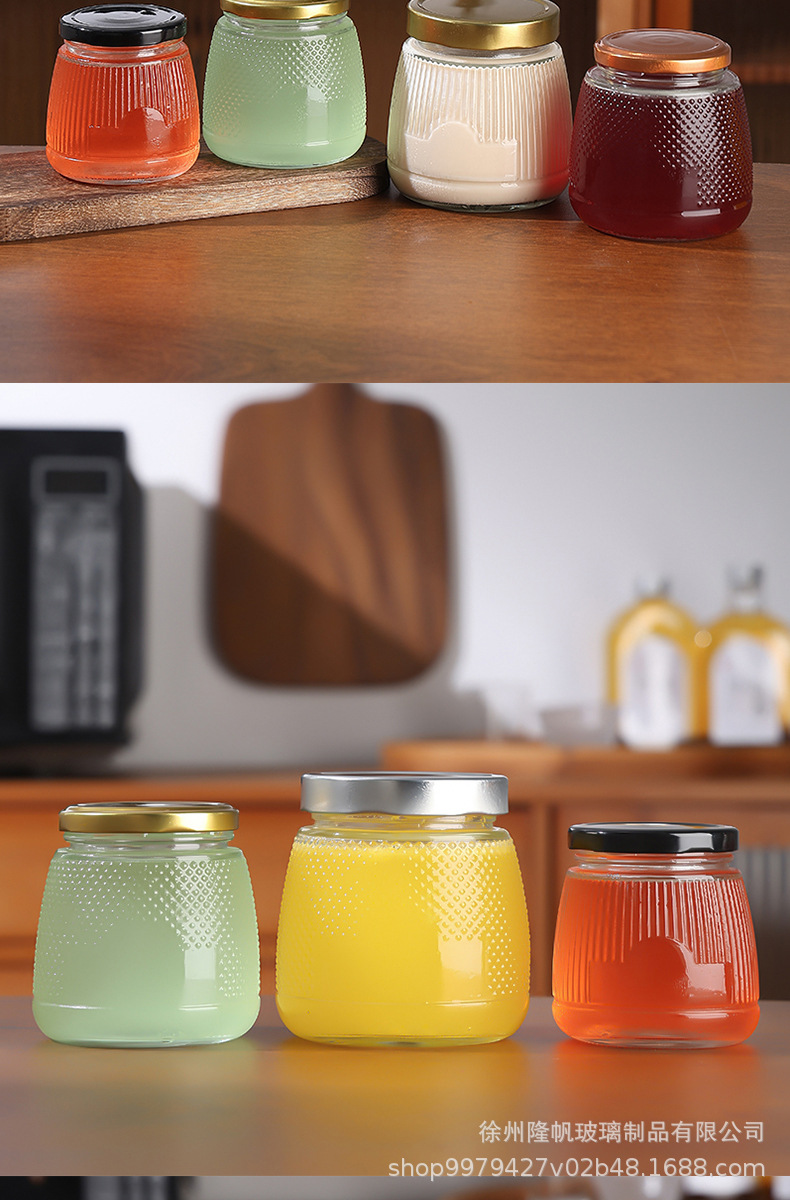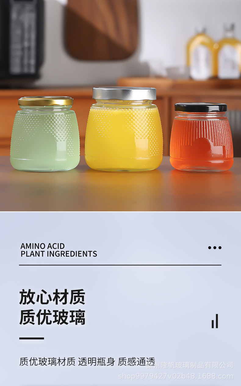 卸売り六稜蜂蜜瓶透明木目蓋ガラス漬物瓶ジャム密封瓶厚いツバメの巣分注瓶