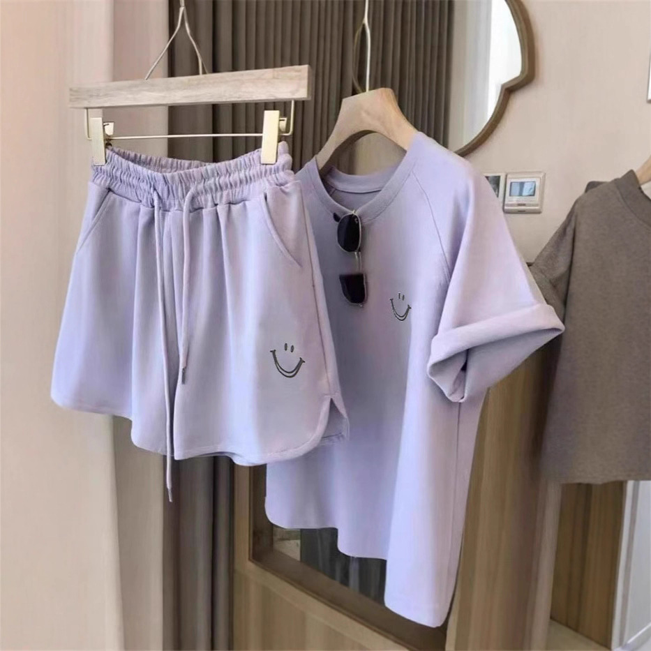 国境を越えた笑顔プリント半袖ショーツカジュアルスポーツスーツ女性がやせてゆるい韓国版学生2点セット潮