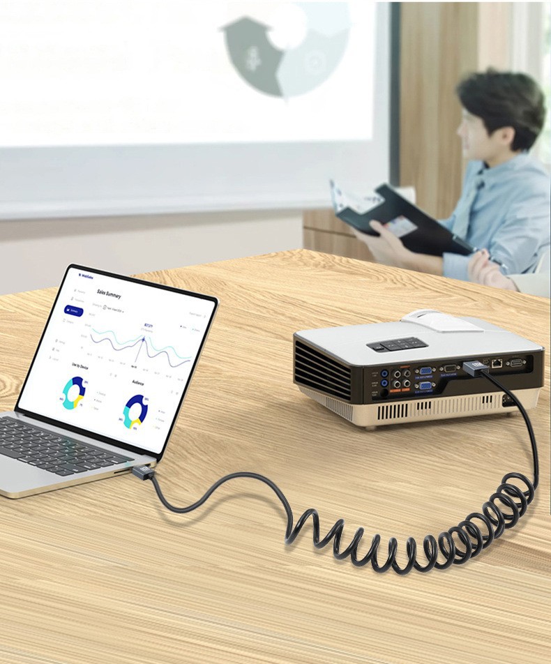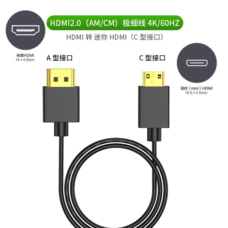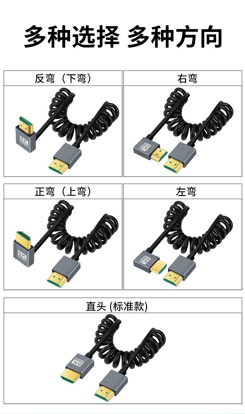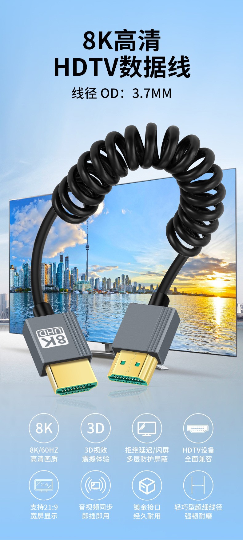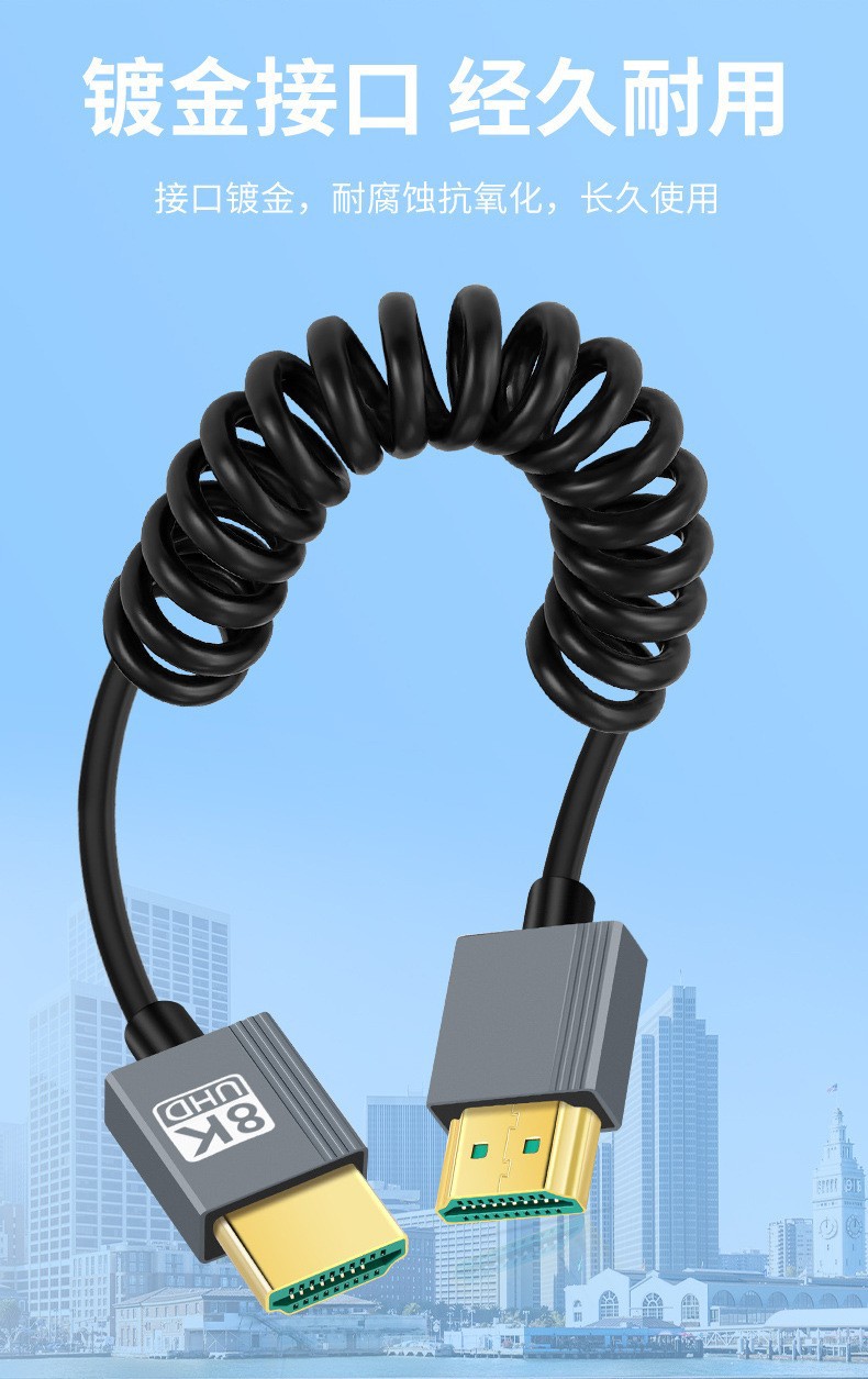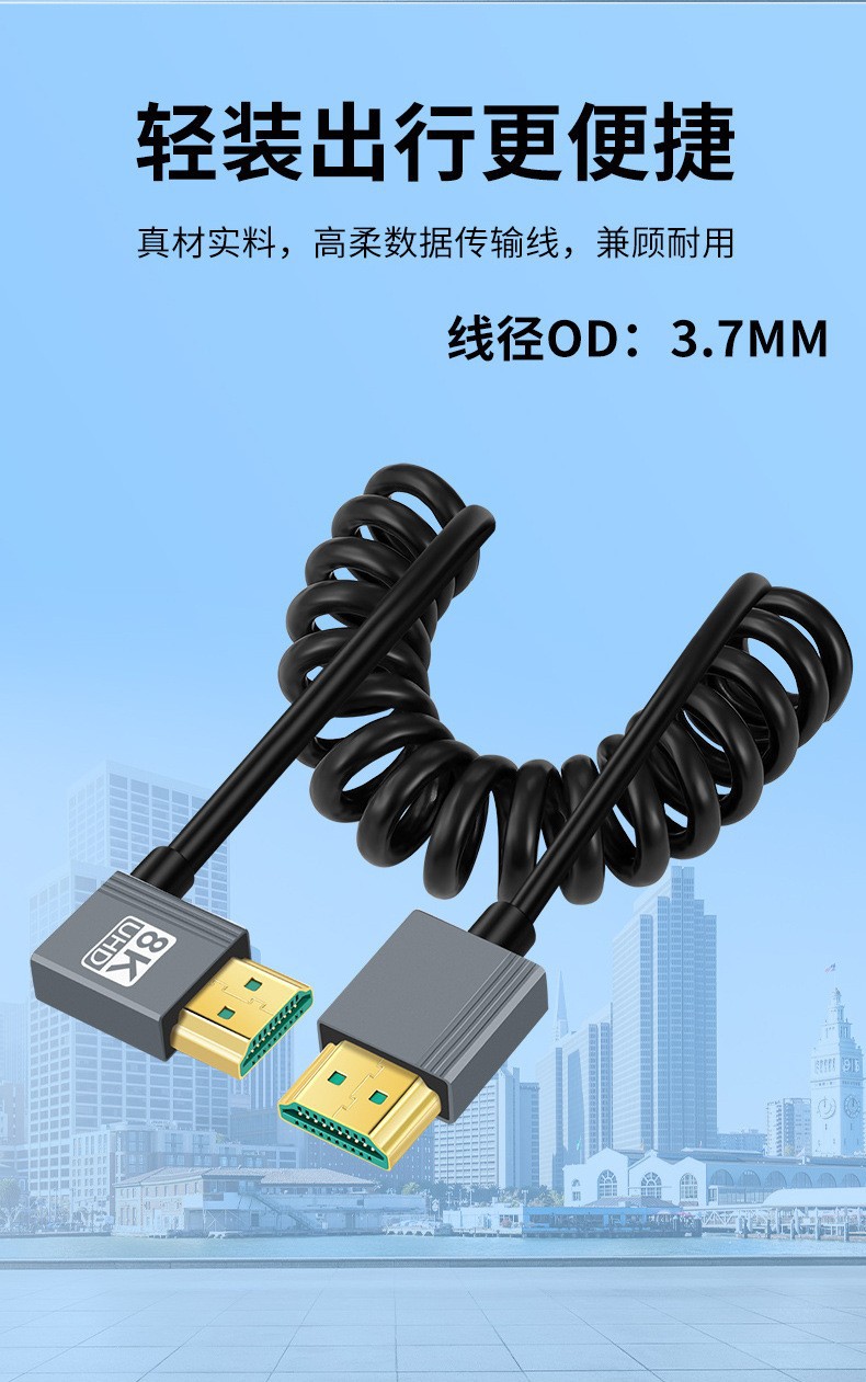 HDTV2.1版极细伸缩弹簧线侧弯头高清摄像机单反软线8k60hz 4k120h