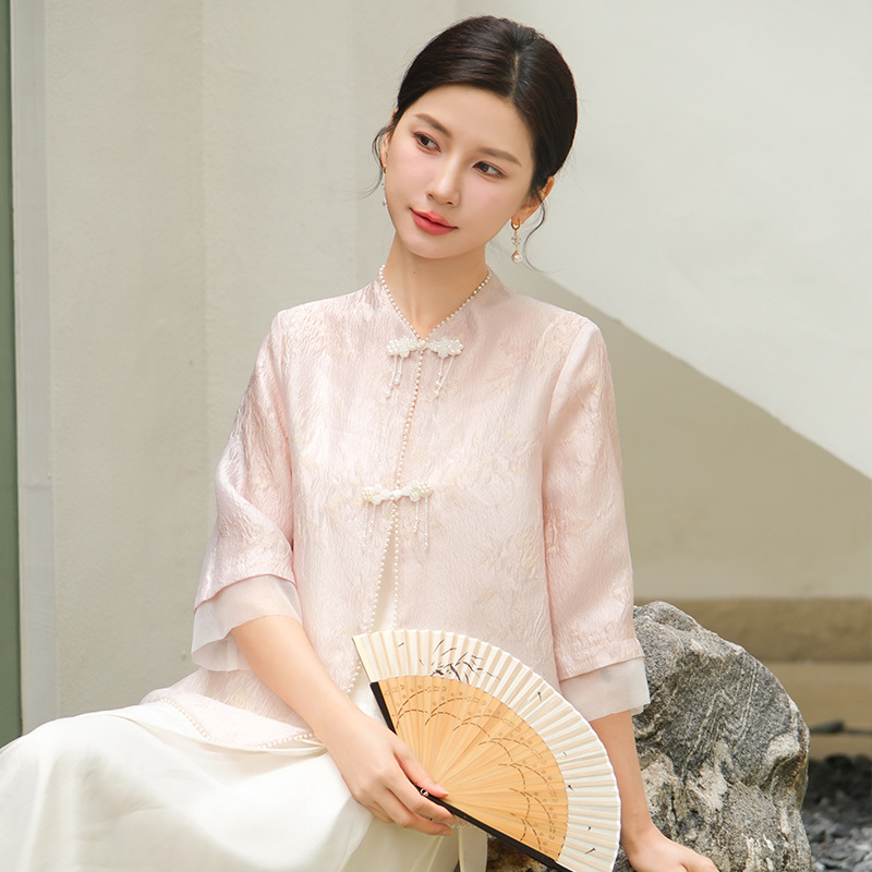 2023夏の新型女性禅茶服ピンク上着新中国風ジャカードコート唐装改良漢服