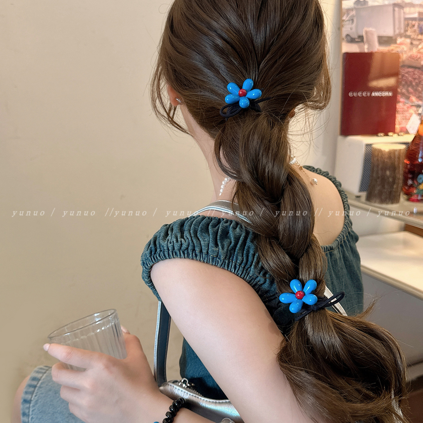 蓝色花朵发圈女2025新款实用百搭扎头发皮套高弹力橡皮筋发绳发饰