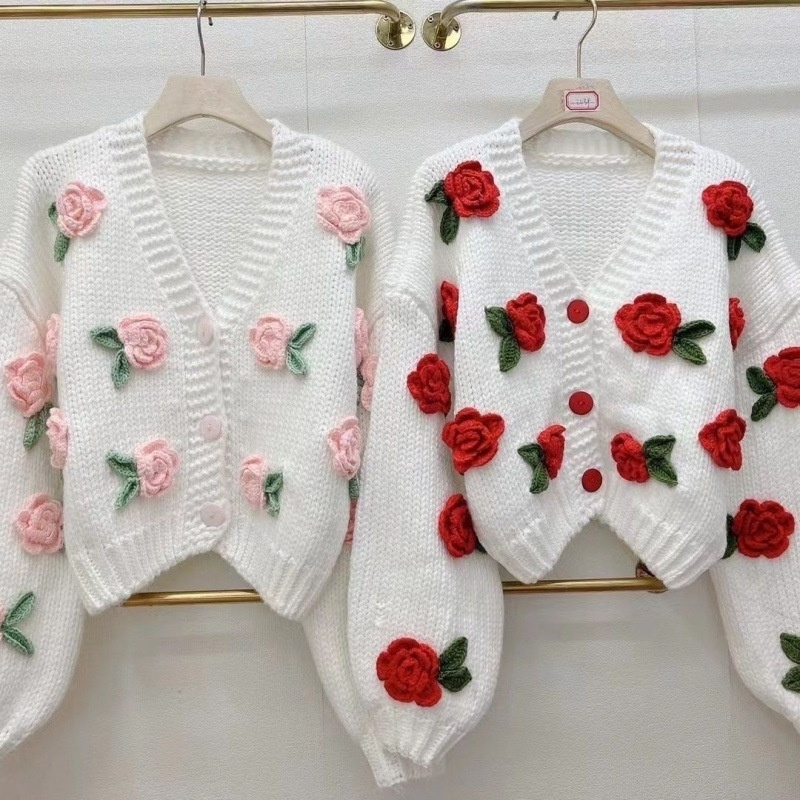 2024秋の香港風レトロなニットの女性の重工のバラの花の刺繍は色のセーターのコートのカーディガンにぶつかります。