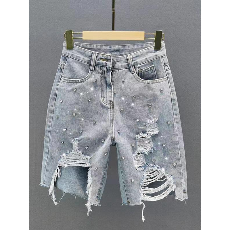 ヨーロッパリップドデニムジーンズ2025夏新作ハイウエストスリムヘビーデューティールーズスリム5点ジーンズ