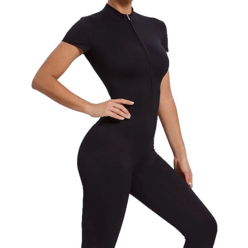 欧美新款高领拉链连体衣瑜伽塑身运动服罗纹短袖紧身服高弹力