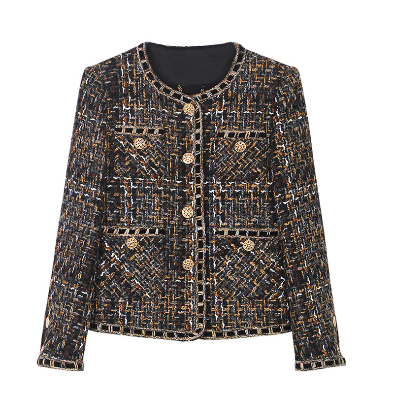 秋のキラキラ夜空ブラックゴールド小香風ツイードヘビーショートジャケットフェミニン通勤トップ