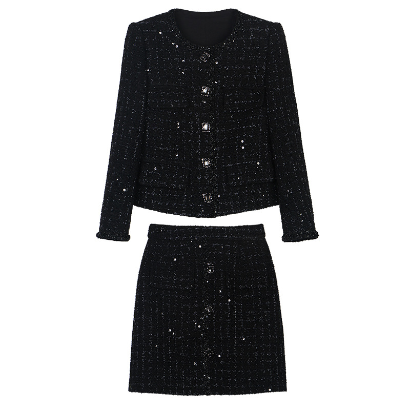 フランス風ファッション、重厚なスパンコール付きツイード素材、高級感のある小香風ジャケットとスカートのセット 28609