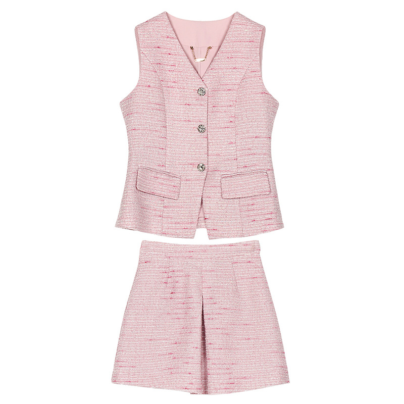 新作レディース花柄ピンクVネック小香風ベストトップス+工字プリーツショートスカートセット29108