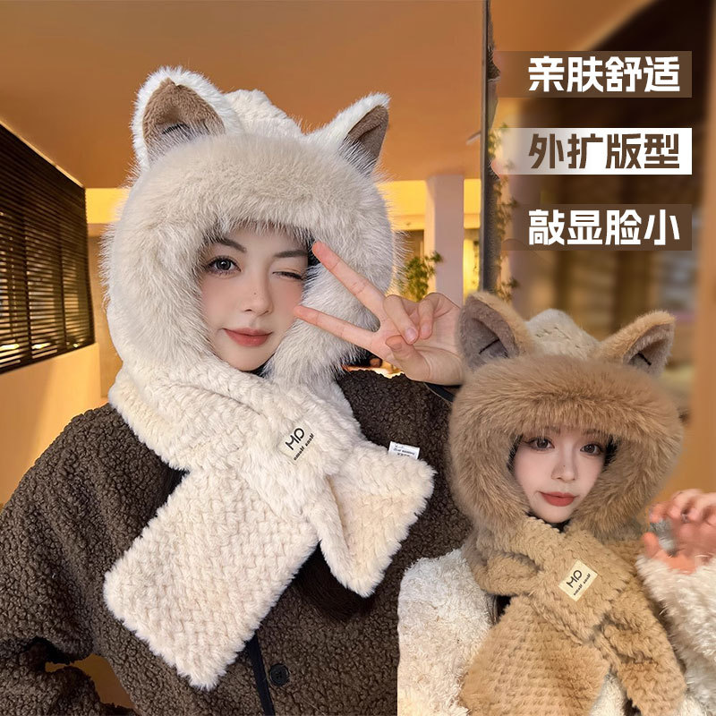 帽子围巾一体女冬季可爱狐狸耳朵围脖护耳毛绒帽加绒保暖骑车冬天