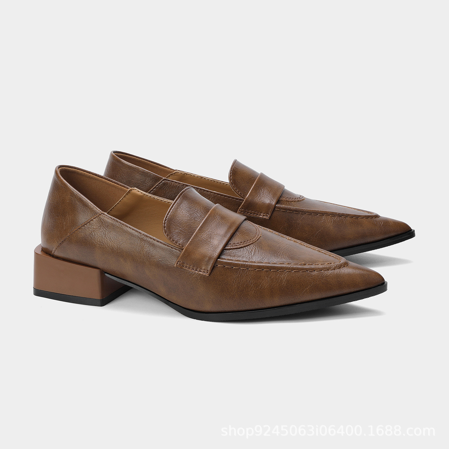 2025年新款时尚百搭复古深口粗跟单鞋时尚高级感尖头软皮懒人鞋女