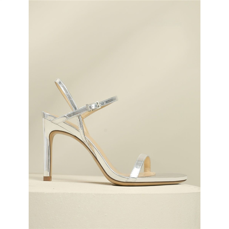 ファッショナブルなパテントレザーシルバーワンストラップハイヒールサンダル女性用スティレットオープントゥ2025夏の新しい多用途ハイヒール