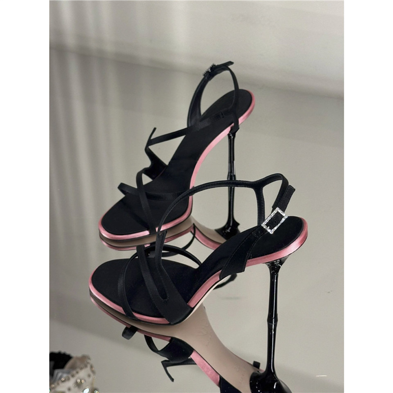 黑色细跟高跟鞋2026新款夏露趾一字带缎面拼色气质百搭约会凉鞋女