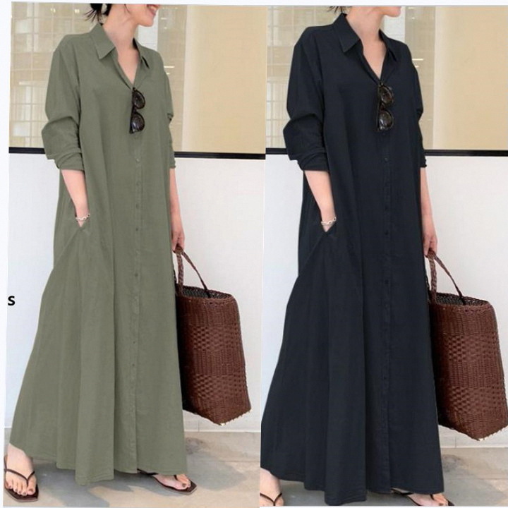 2025 春と秋の新ヨーロッパとアメリカンスタイルの無地ラペル長袖ポケットシンプルなルーズカジュアルロングシャツドレス