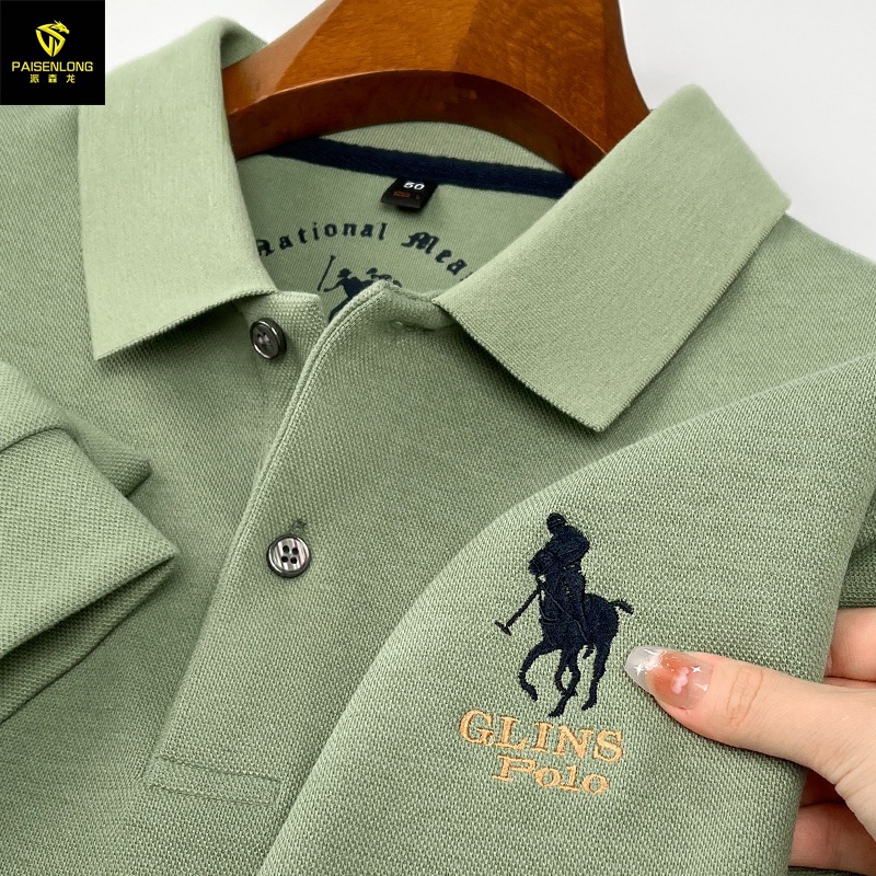 派森龍秋冬純綿両面玉地メンズPOLOシャツ長袖折り襟ロングパイル綿ポール刺繍男POLO