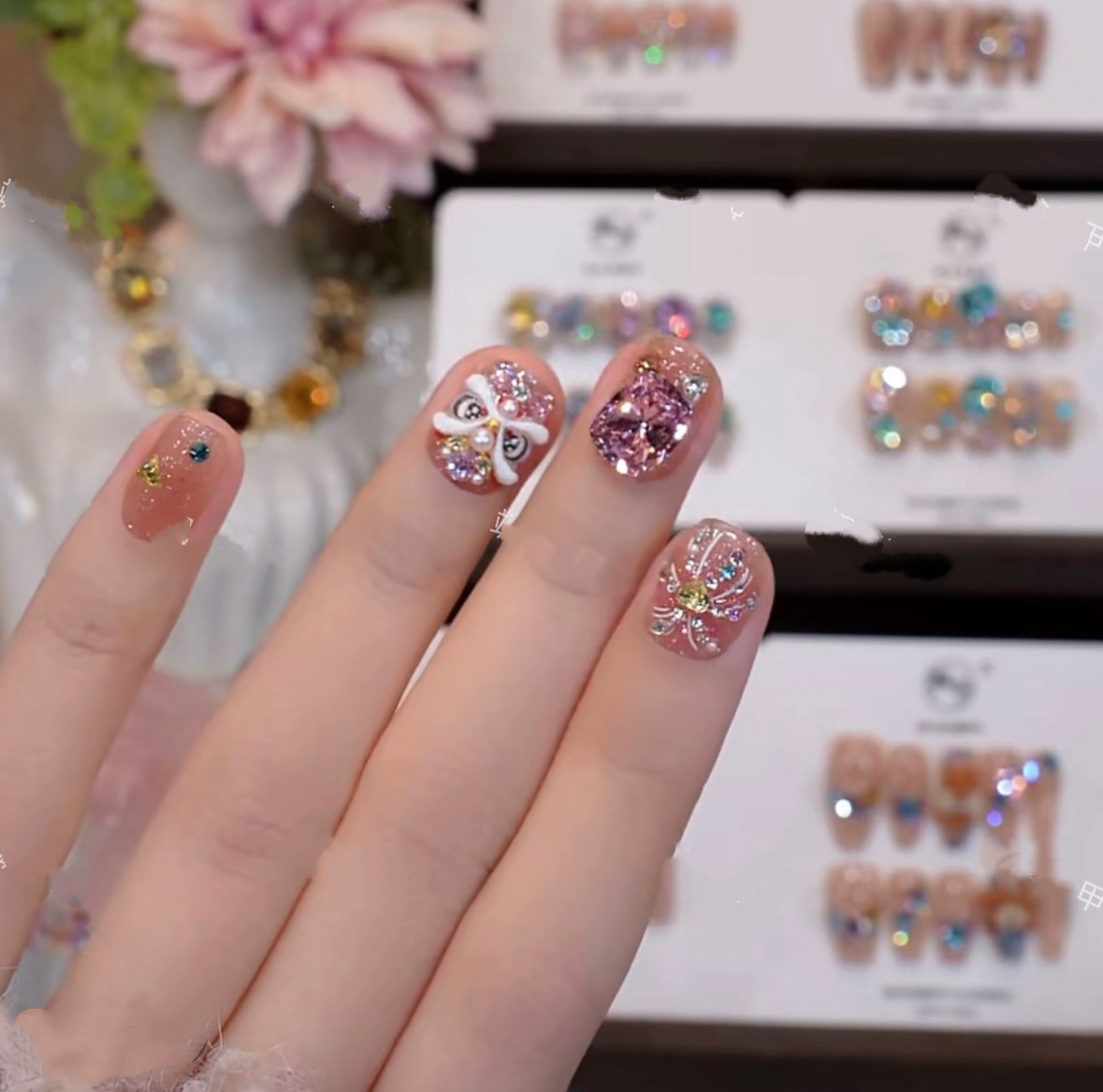 【暴富醒狮】纯手工穿戴甲爆闪钻球成品高级感显白纯手作美甲贴片