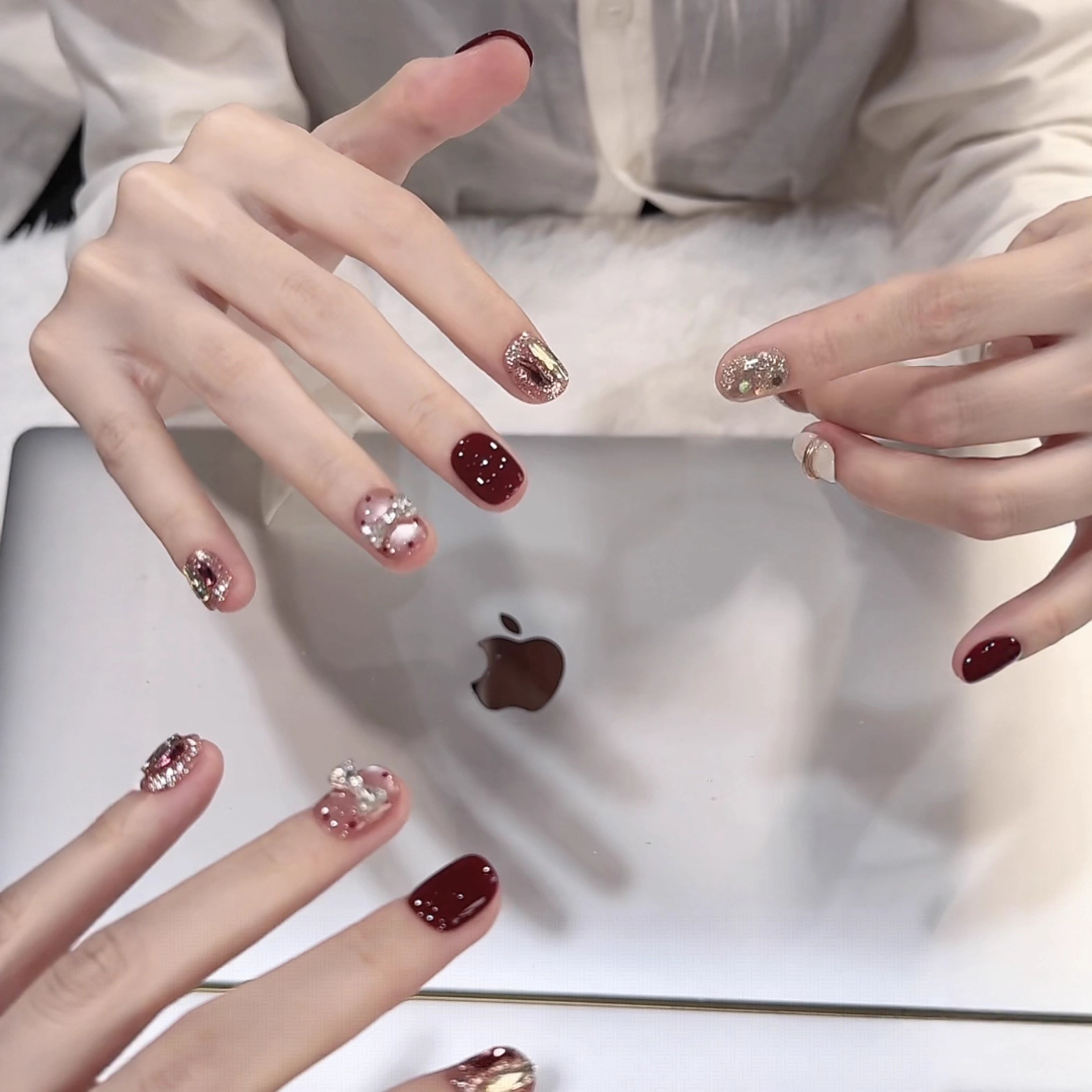 【甜梦千金】秋冬新款纯手工穿戴甲酒红蝴蝶高级显白纯手作美甲片