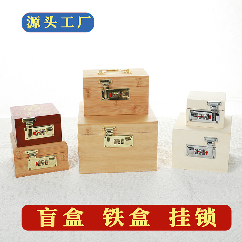 复古实木盒子密码锁盲盒家用证件杂物木质收纳箱通用翻盖木盒带锁