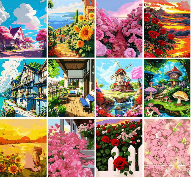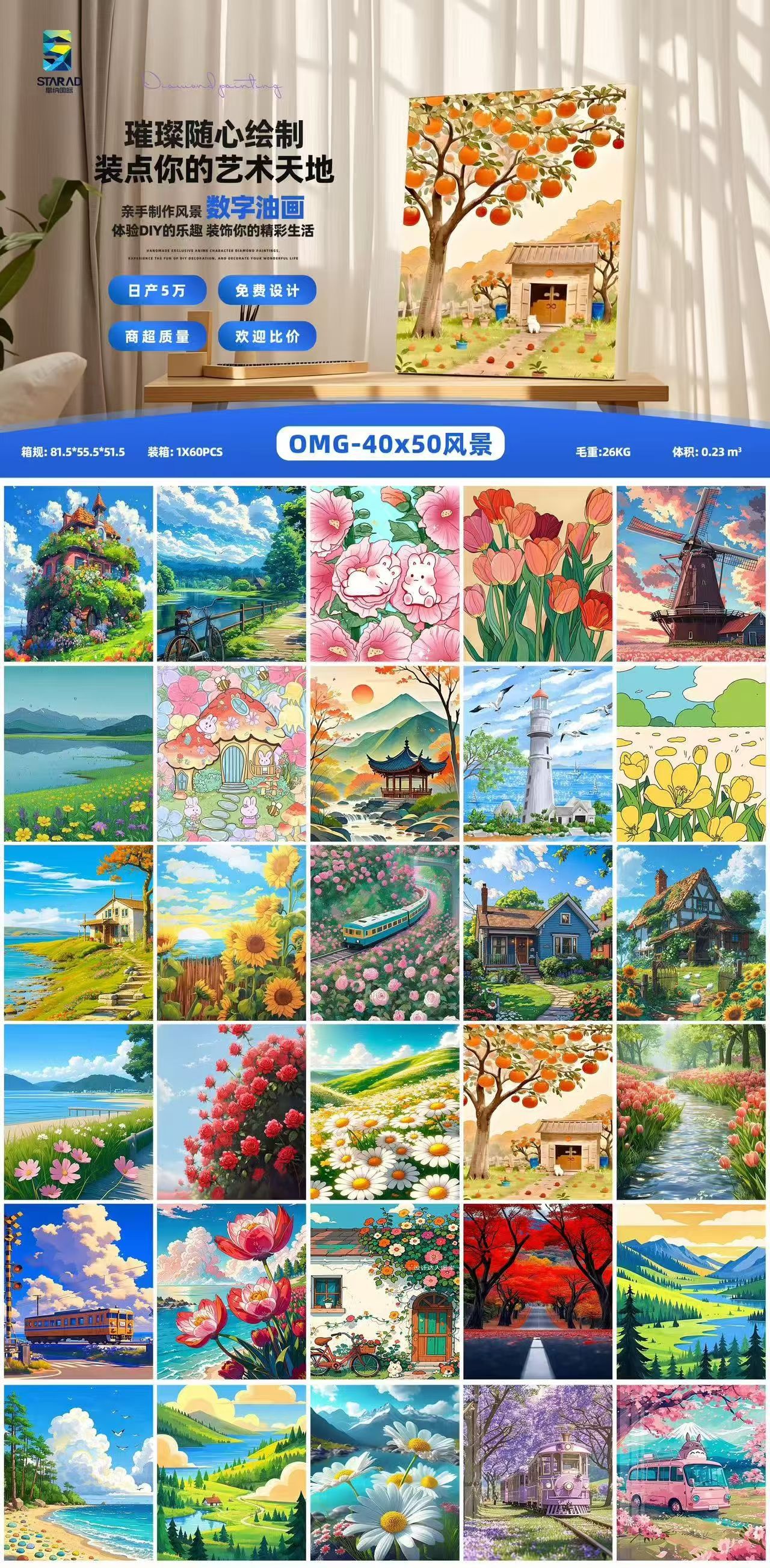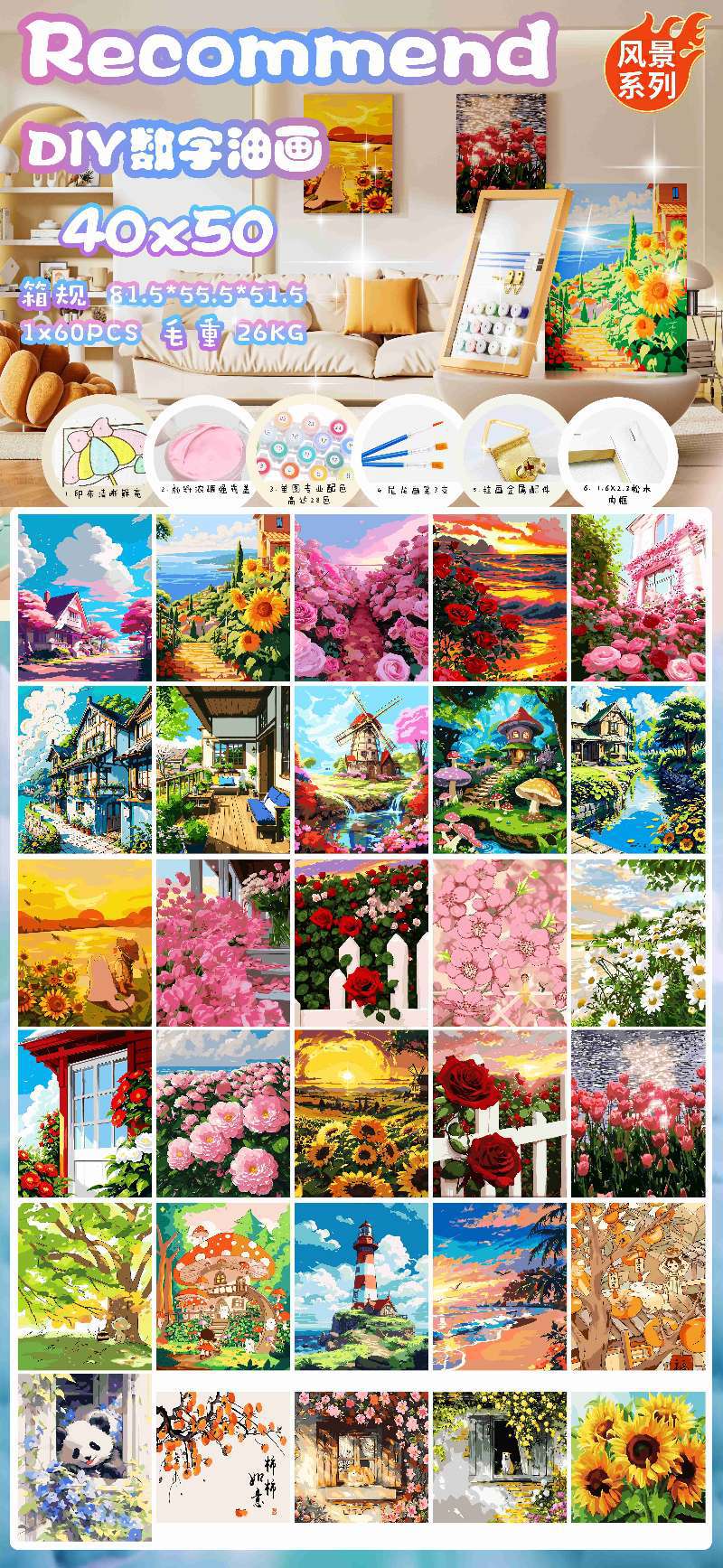 厂家直发,40*50数字油画,产品尺寸40*50cm,一箱60个混装,有风景和动漫卡通,财神等图案,发货混装,谢谢,量大有优惠!