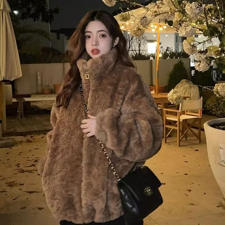 立领羊羔毛外套女2025冬新款韩系慵懒风加厚皮毛一体仿貂毛绒上衣